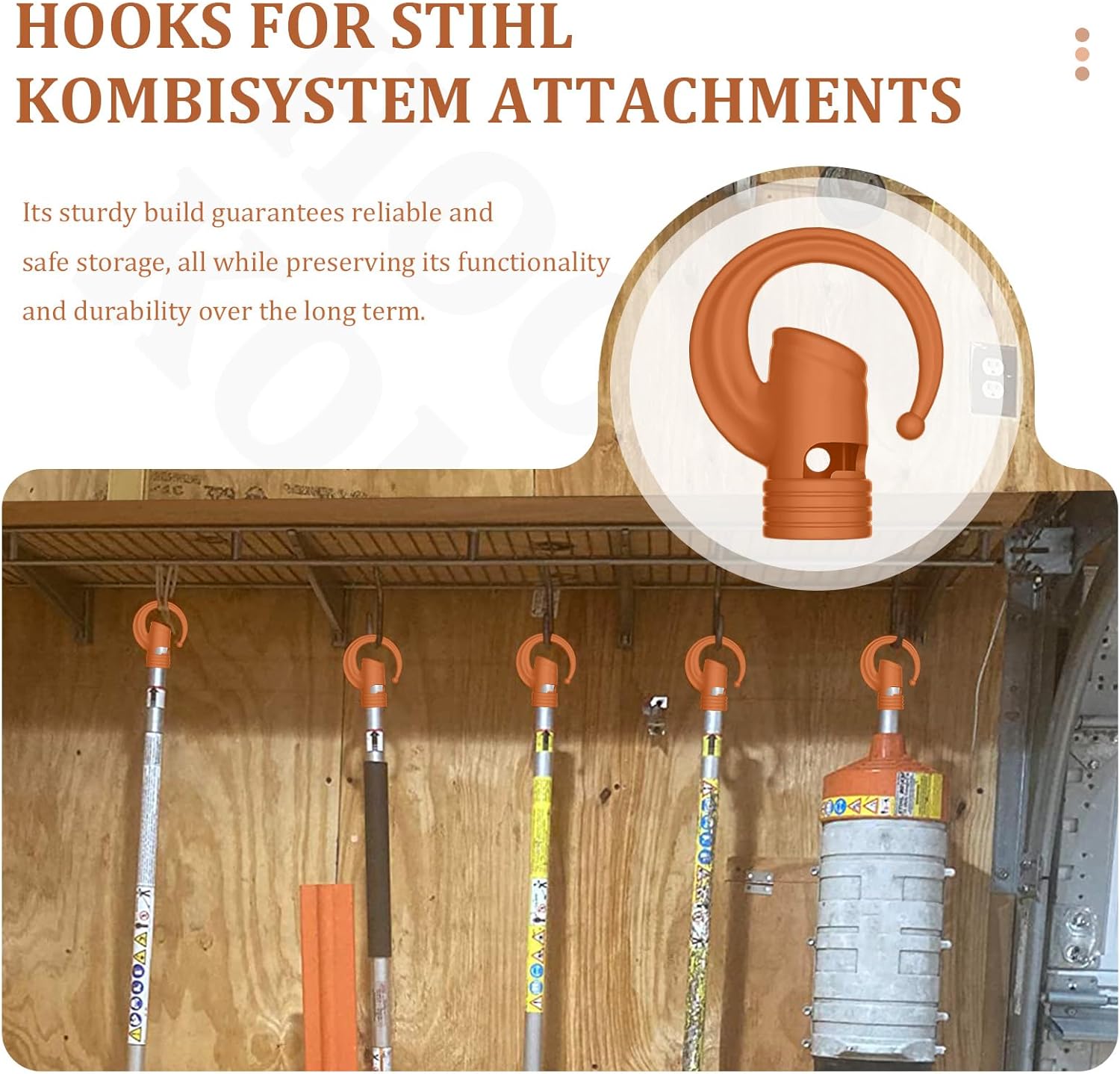 - Hooks Compatible with Stihl Kombi and Dewalt Attachments: Our hanger features a notch and locking mechanism perfectly fit for Stihl Kombi Attachment storage. Additionally, a small hole at the back makes it compatible with Dewalt Attachments, ensuring maximum versatility