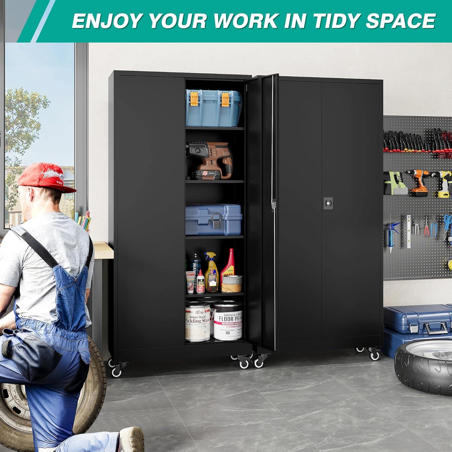 SISESOL Metal Storage Cabinet with Wheels,75 inch Tall Rolling Garage Storage Cabinet with Lock,Black Metal Cabinets with Wheels and Shelves,Deep Heavy Duty Tool Locker for Garage,Home,Office,Shop
