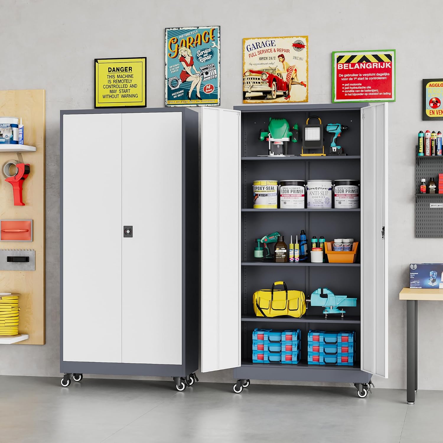 75" Tall Metal Storage Cabinet with Wheels,Rolling Garage Storage Cabinet with Lock,Gray White Metal Cabinets with Wheels and Shelves,Locking Tool Cabinets on Wheel for Garage,Home,Office,Shop