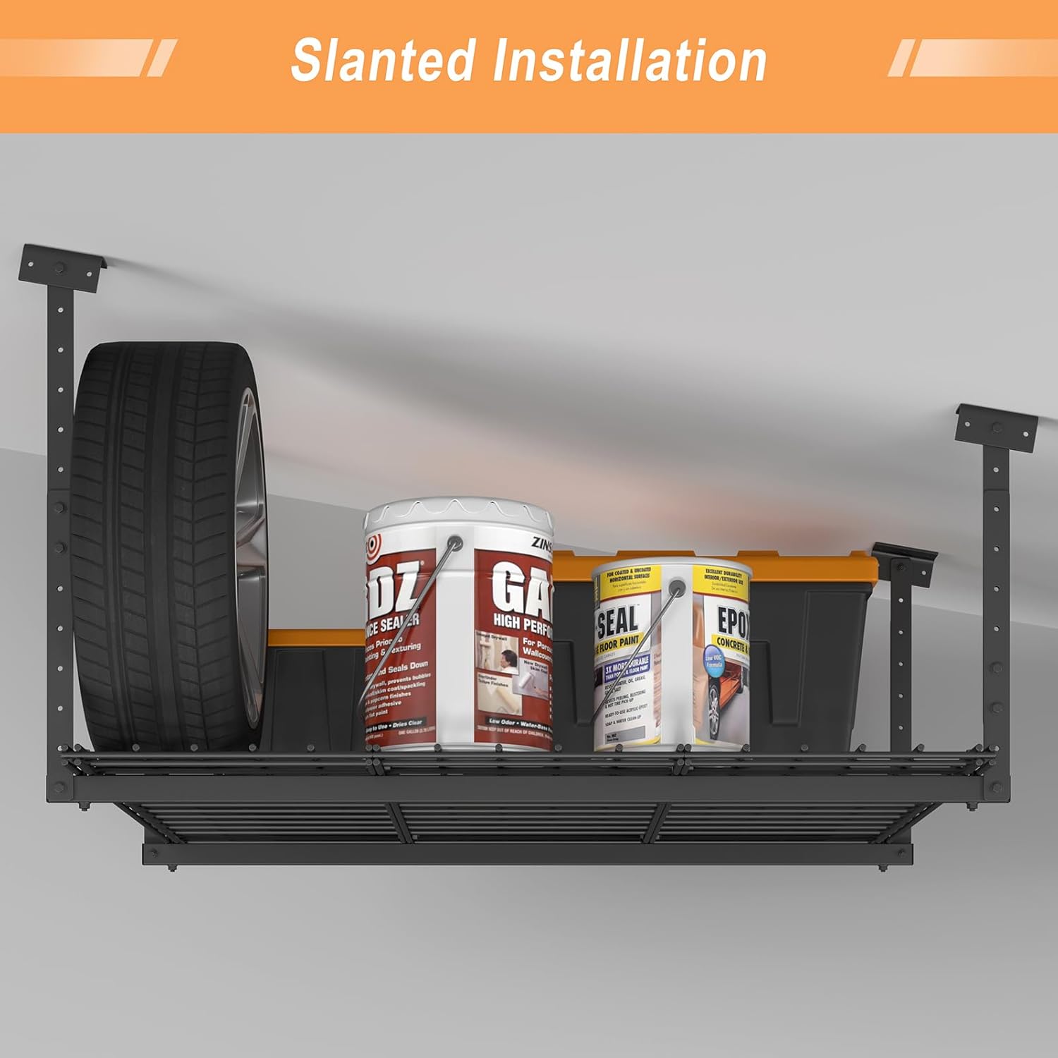 - 🏆【Heavy-Duty 250 lbs Capacity】- Crafted with industrial-grade cold-rolled steel, our garage ceiling storage rack securely holds up to 250 lbs. Perfect for bulky seasonal items, toolboxes and outdoor gear.