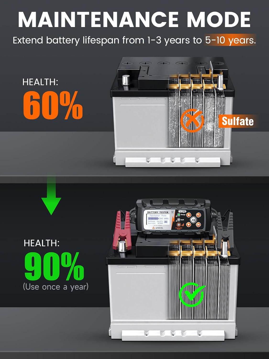 - BATTERY MAINTENANCE & REPAIR: High-frequency pulses help break down lead sulfate crystals which may restore electrode activity and improve battery capacity by up to 90%. The unique maintenance mode clears buildup during charging to help prevent long-term damage. Regular use can extend battery life 2-3 times and reduce replacement costs