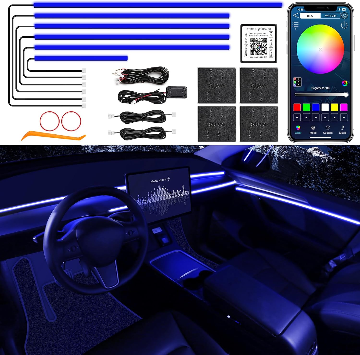 - ăHigh Bright & UniformăThe RGB Acrylic LED Car Ambient Interior Lighting have super bright LED and acrylic lens and contains 6 LED strips (4*29.5inch+1*43.3inch+1*14inch), also comes with 1 main controller and 4 sub controllers,and can be flexibly installed on any car by DIY without disorganized, which is plug and play, and this acrylic light evenly spread over the lamp strip is brighter, more uniform and softer than other optical fiber lamps that rely on only one LED.