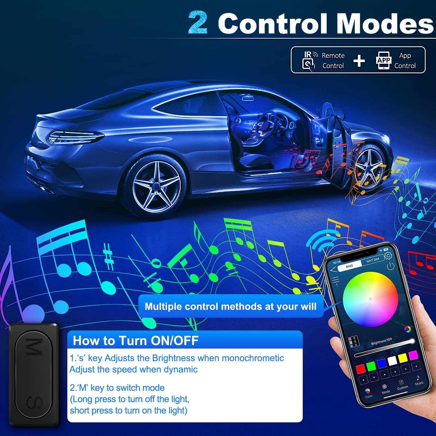 - ă2 Control ModesăThe LED Symphony Ambient Lighting Kit Fiber Optic uses wireless âLED LAMPâ APP for control suitable for IOS or Andriod. Hidden S&M touch button: single touch S key to Adjusts the Brightness when monochrometic, Adjust the speed when dynamic, âMâ key to switch mode.(Long press to turn off the light, short press to turn on the light).