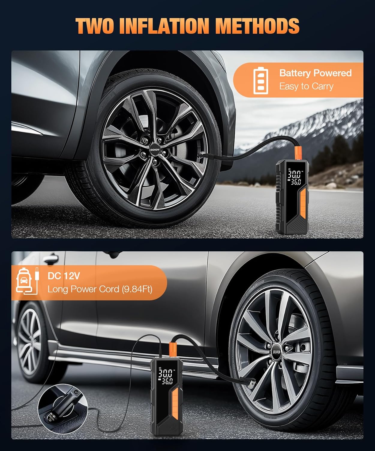 - Fast Inflation: The tire inflator portable air compressor provides 150 PSI maximum pressure and 36L/Min airflow, from 32 PSI to 36 PSI in 50S, one full charge can inflate 3-4 195/55/R15 car tires (0-36 psi)