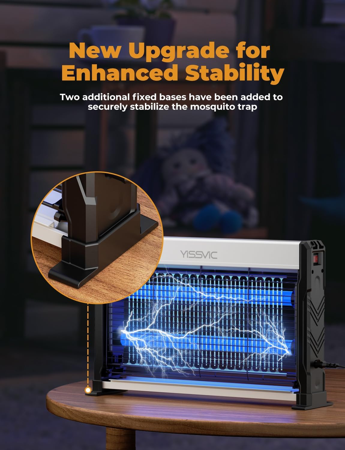 - (Hanging Chain and Stand Base For Multipurpose Use) The bug zapper with a protective mesh to prevent accidental contact with the electrical mesh. Equipped with a hanging chain and two stand bases, it offers flexible placement options,either suspended or placed on a desktop.