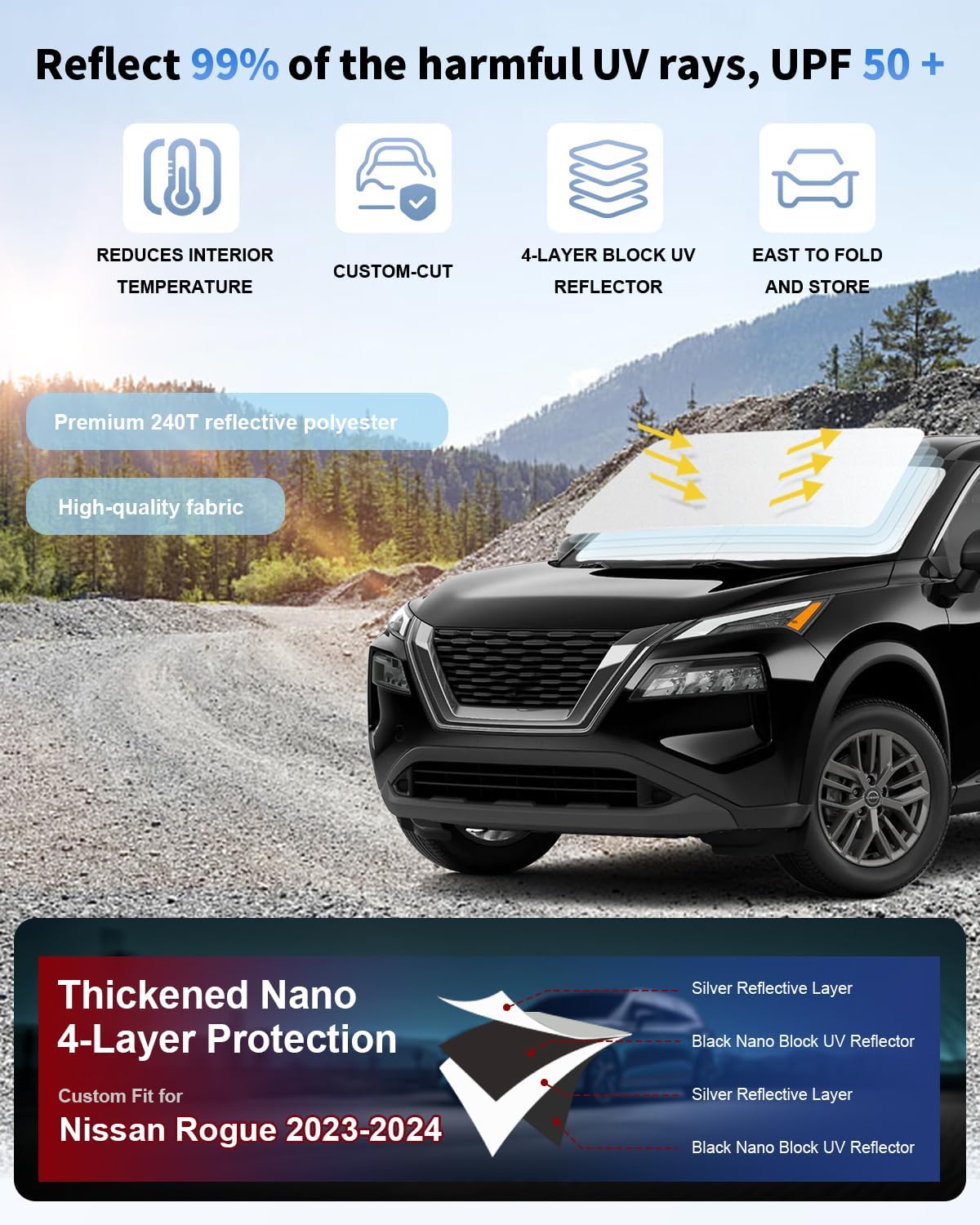 - [EFFECTIVE UV PROTECTION] custom-fit Windshield Shades make the temperature as redued, it reduces heat by a considerable amount. Blocks up to 99.8% of damaging UV rays and Heat build-up. Effectively reflects UV rays while specially crafted from 4-layer 240T durable materials to reduce heat by up to 40Β°F, ensuring a comfortable driving experience even on the hottest days