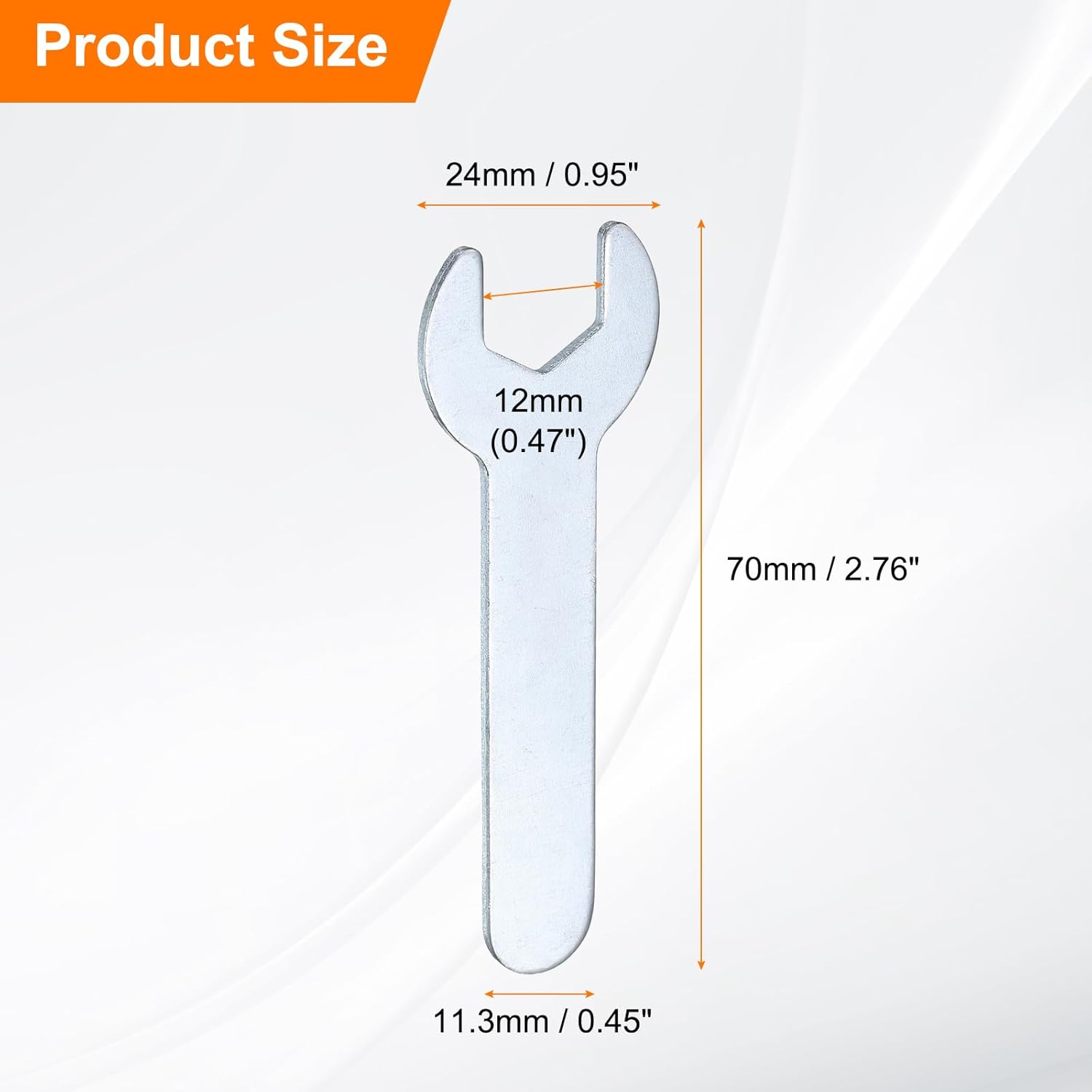 - Size - Open end: 12mm / 0.47"; Open outside width: 24mm / 0.95"; Total length: 70mm / 2.76"; Stem thickness: 1.5mm / 0.06"; Stem width: 11.3mm / 0.45"; Color: Silver-grey; Package includes: 10 x Single open-end wrenches. The open wrench set is thin enough to work on tight spots.