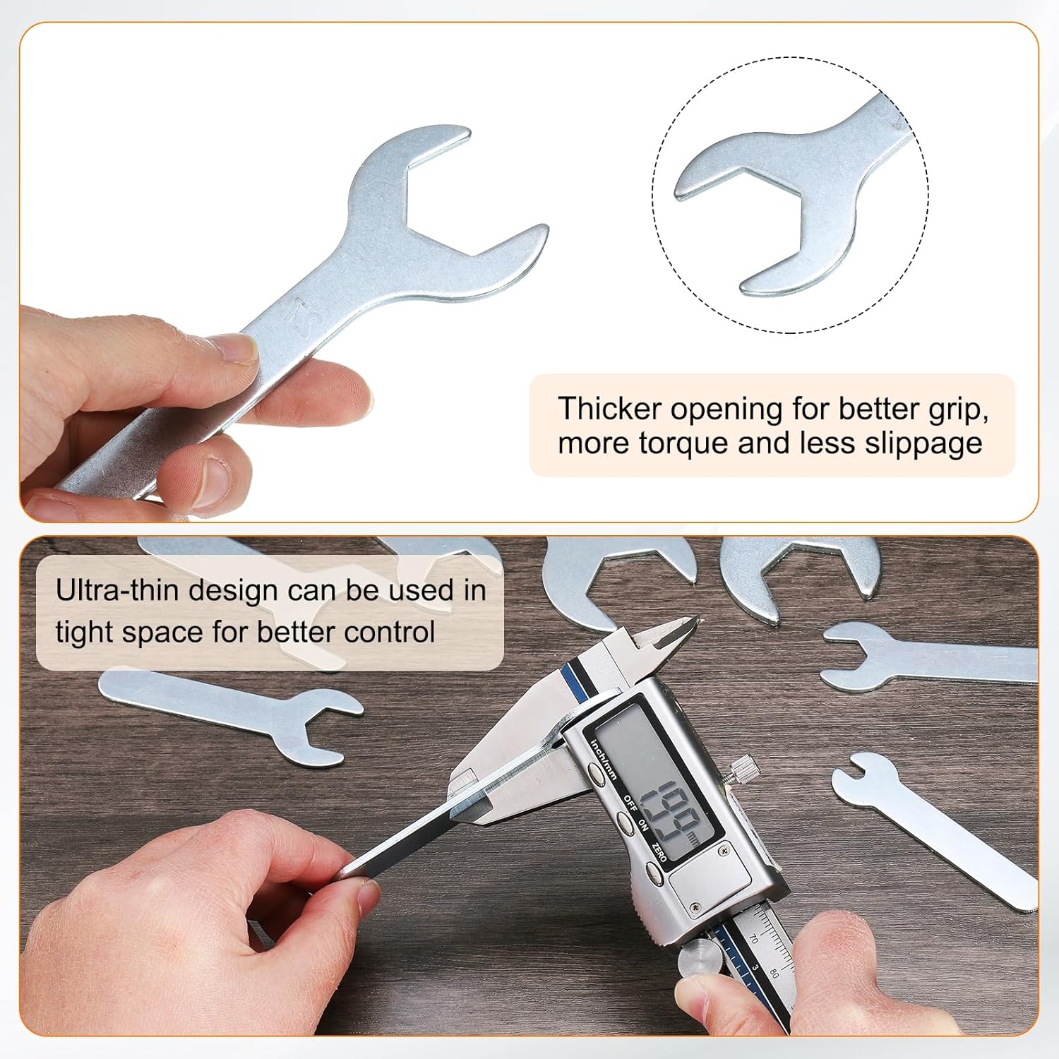 - Size - Open end: 27mm / 1.06"; Open outside width: 45.3mm / 1.78"; Total length: 140mm / 5.51"; Stem thickness: 2.6mm / 0.1"; Stem width: 14.5mm / 0.57"; Color: Silver-grey; Package includes: 10 x Single open-end wrenches. The open wrench set is thin enough to work on tight spots.