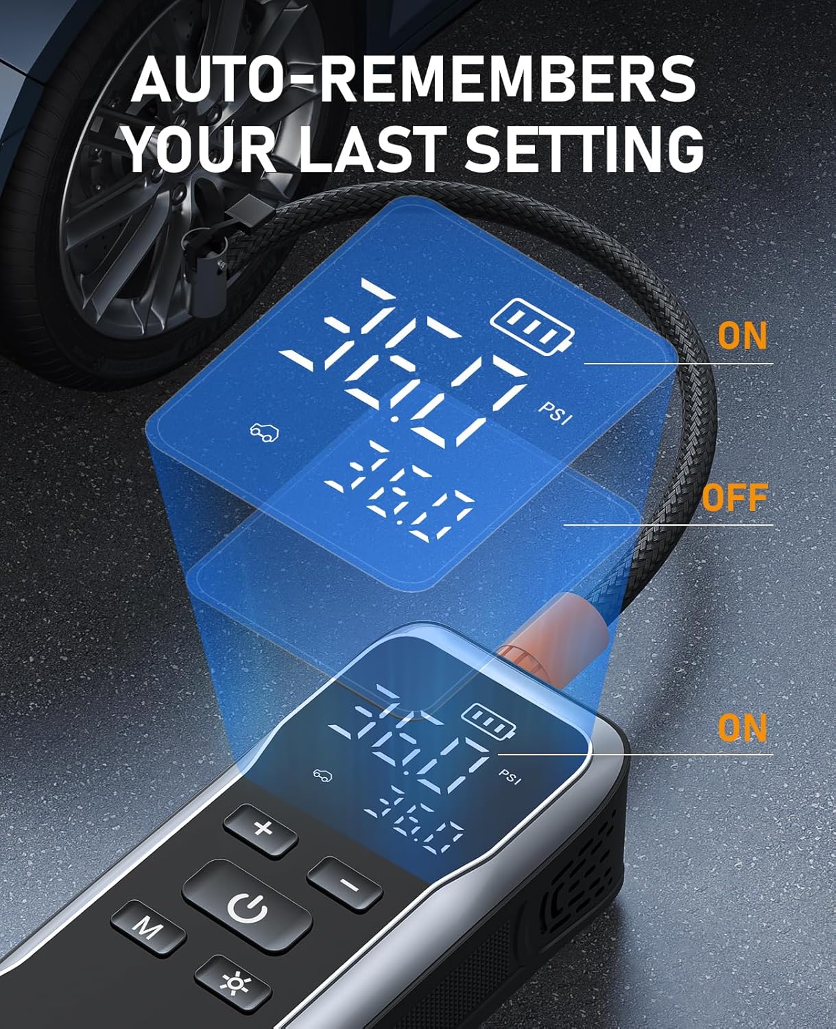 - Preset Pressure & Memory Function-Pre-calibrated modes for cars (36PSI), bikes (45PSI), motorcycles (32PSI), and balls (9PSI). You can start using it right away without any complex settings. Moreover, its memory function remembers the last used mode and parameters. So next time you use it, you don't need to adjust the tire pressure repeatedly, making it extremely user - friendly for regular users. ideal for households managing multiple vehicles.