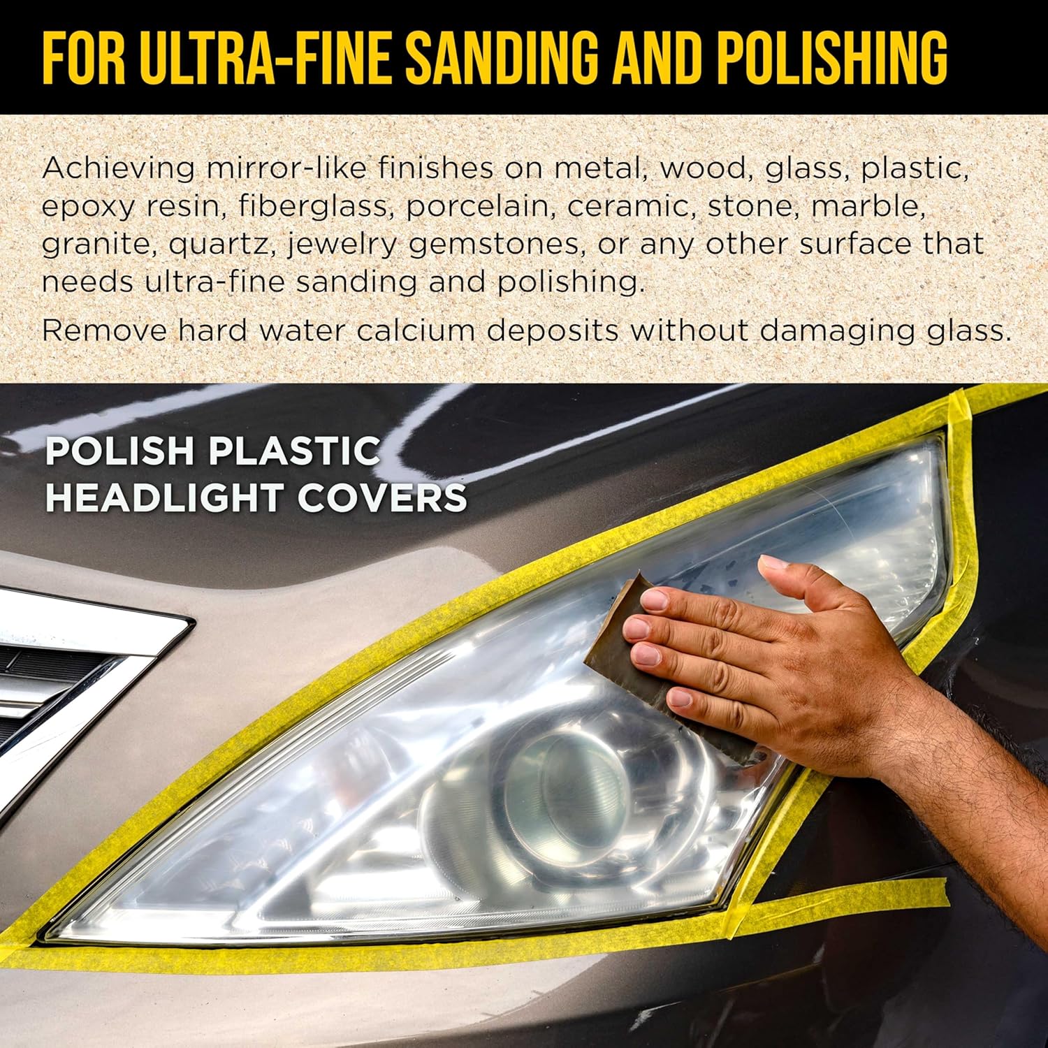 - These 5000-grit super-fine-cut waterproof sandpaper sheets are ideal for ultra-fine color sanding and polishing on auto paint finishes in autobody and detailing shops and for achieving mirror-like finishes on metal, wood, glass, plastic, epoxy resin, fiberglass, porcelain, ceramic, stone, marble, granite, quartz, jewelry gemstones, or any other surface that needs ultra-fine sanding and polishing. Remove hard water calcium deposits without damaging glass. Polish plastic headlight covers.
