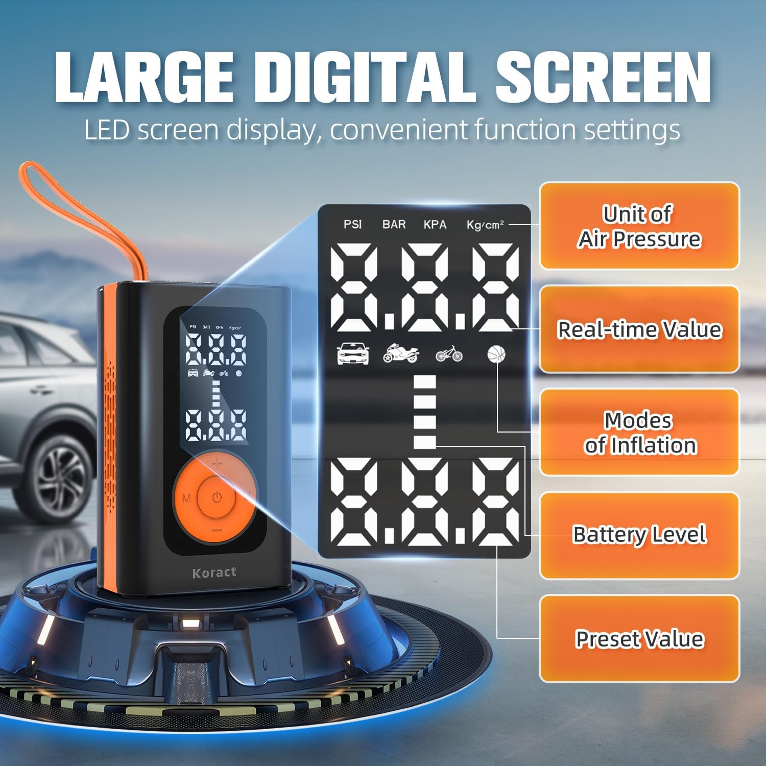 - Smart Auto-Shutoff Function: Press the "Start" button and the air compressor portable will automatically inflate according to your preset target pressure. When the set pressure value is reached, it will automatically stop inflating. The tire inflator provides 4 smart inflation modes (car, motorcycle, bicycle, ball) and custom mode, and 4 inflation units (PSI, Bar, kPa, kg/cmยฒ) for you to choose