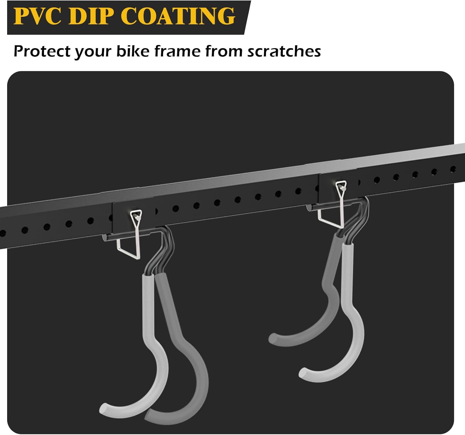 - ADJUSTABLE HOOK: The distance of all hooks can be adjusted according to the width of the bicycle, which can hang bicycles of different sizes to meet the needs of your family. Can store different types of bikes including road bikes, mountain bikes and children's bikes.