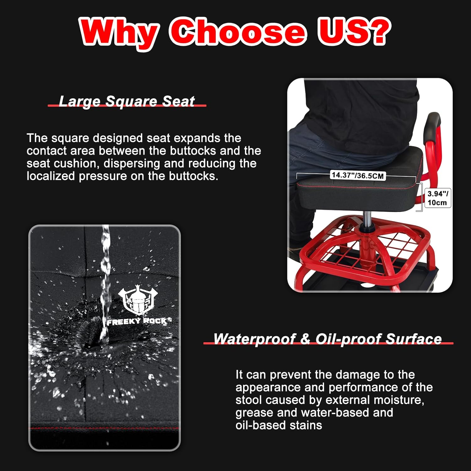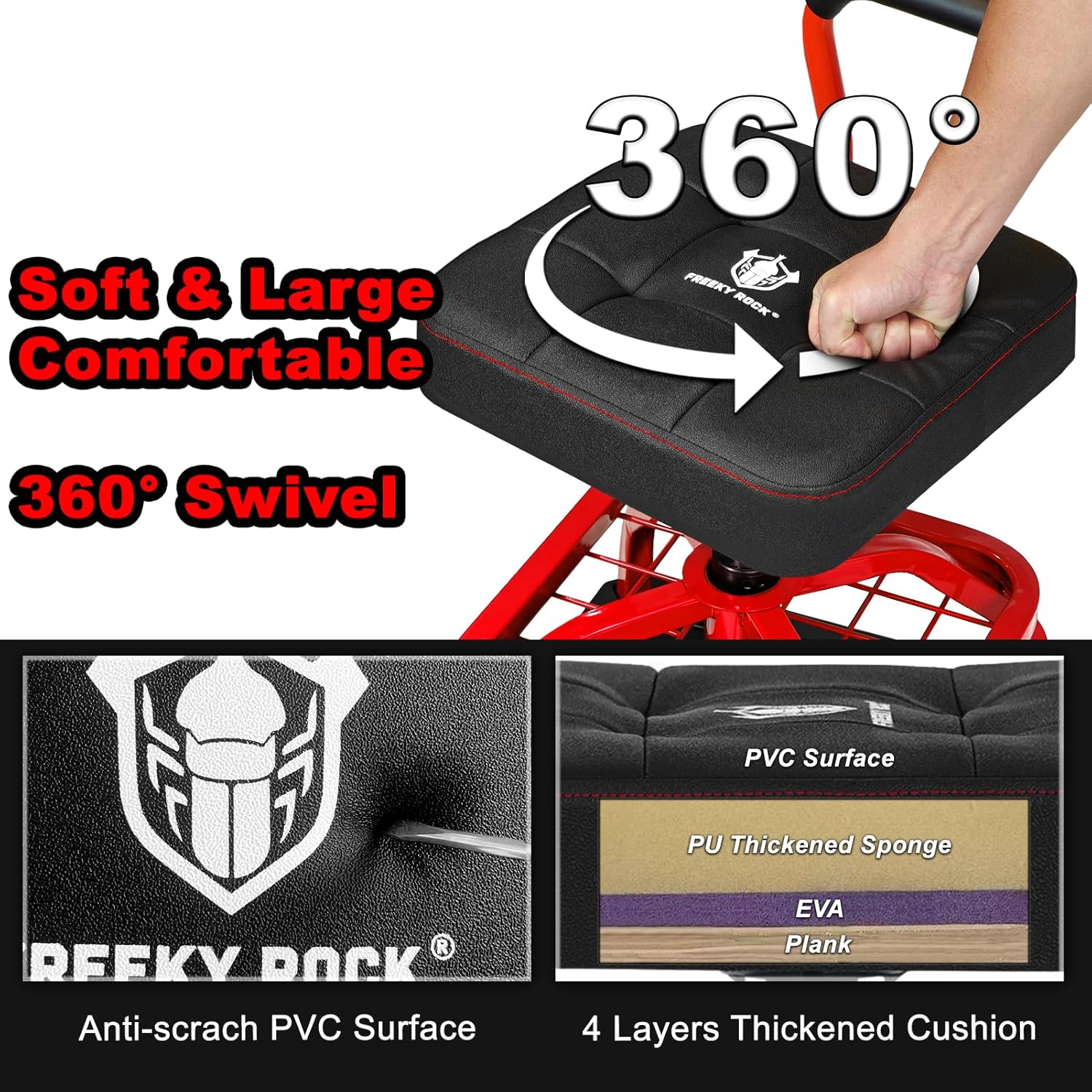 - ăThickened Seat Cushionă14.37"/36.5CM Diameter Seat. 3.94"/10 CM height cushion. The thickened memory foam padded cushion seat is larger than other garage work stools. The cushion surface of stool is made of PVC material which is waterproof and oilproof, making it easy to be cleaned.