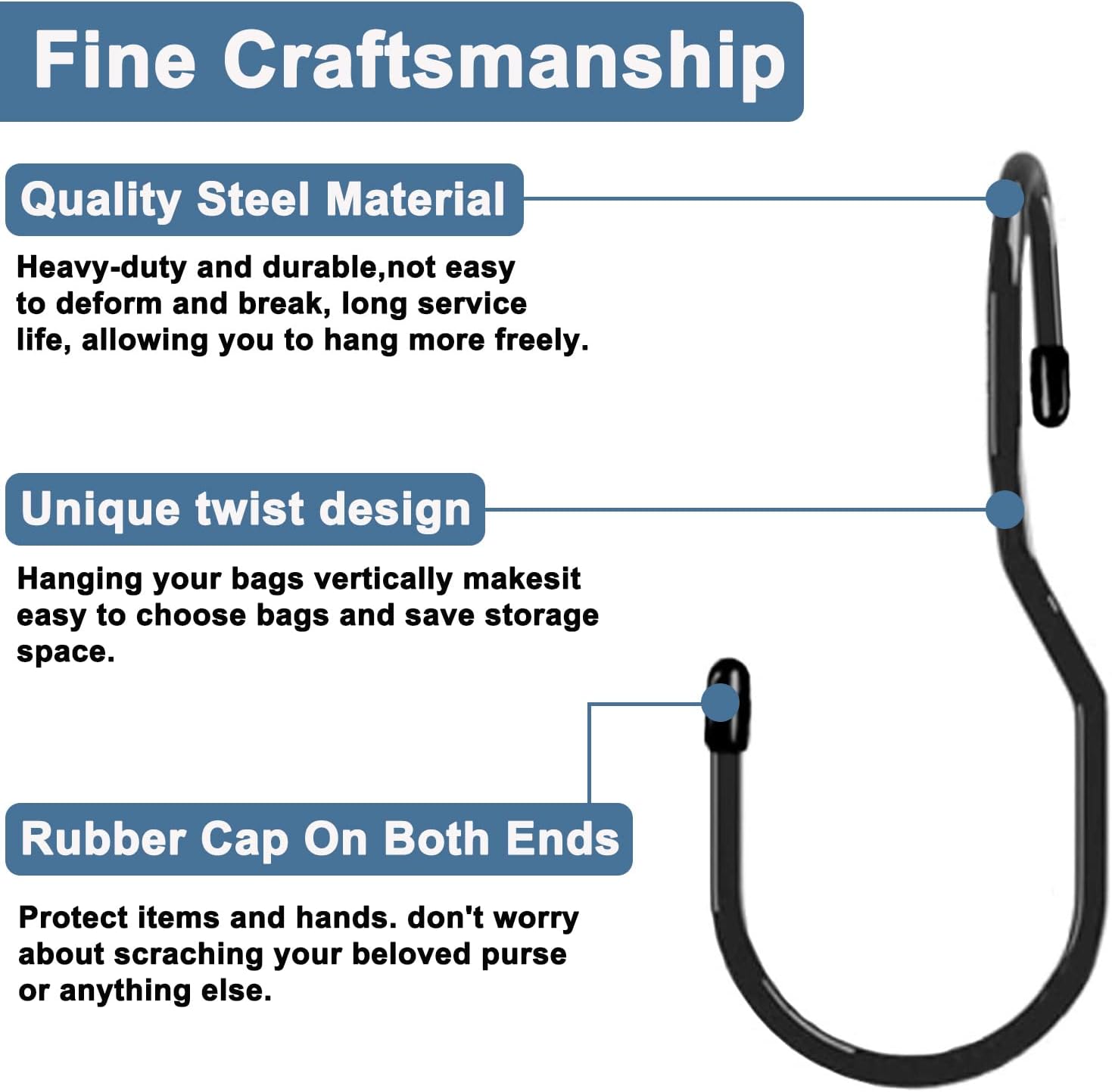 - 【Safe & Secure】The hooks feature rubber stoppers on both ends, preventing items from slipping off while also protecting your belongings and hands from scratches. The rubber coating ensures a soft, non-abrasive surface.