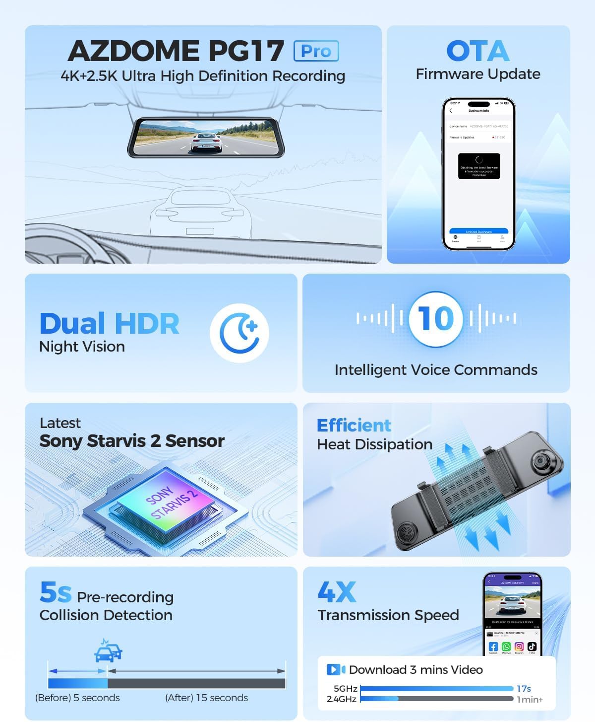 AZDOME PG17 Pro Mirror Dash Cam Front and Rear with IMX678, STARVIS 2 Rear View Mirror Camera with 5.8GHz WiFi, 4K+2.5K Dashcam, OTA Upgrade, Timeline Playback, Dual HDR, Voice Control, 128GB Card