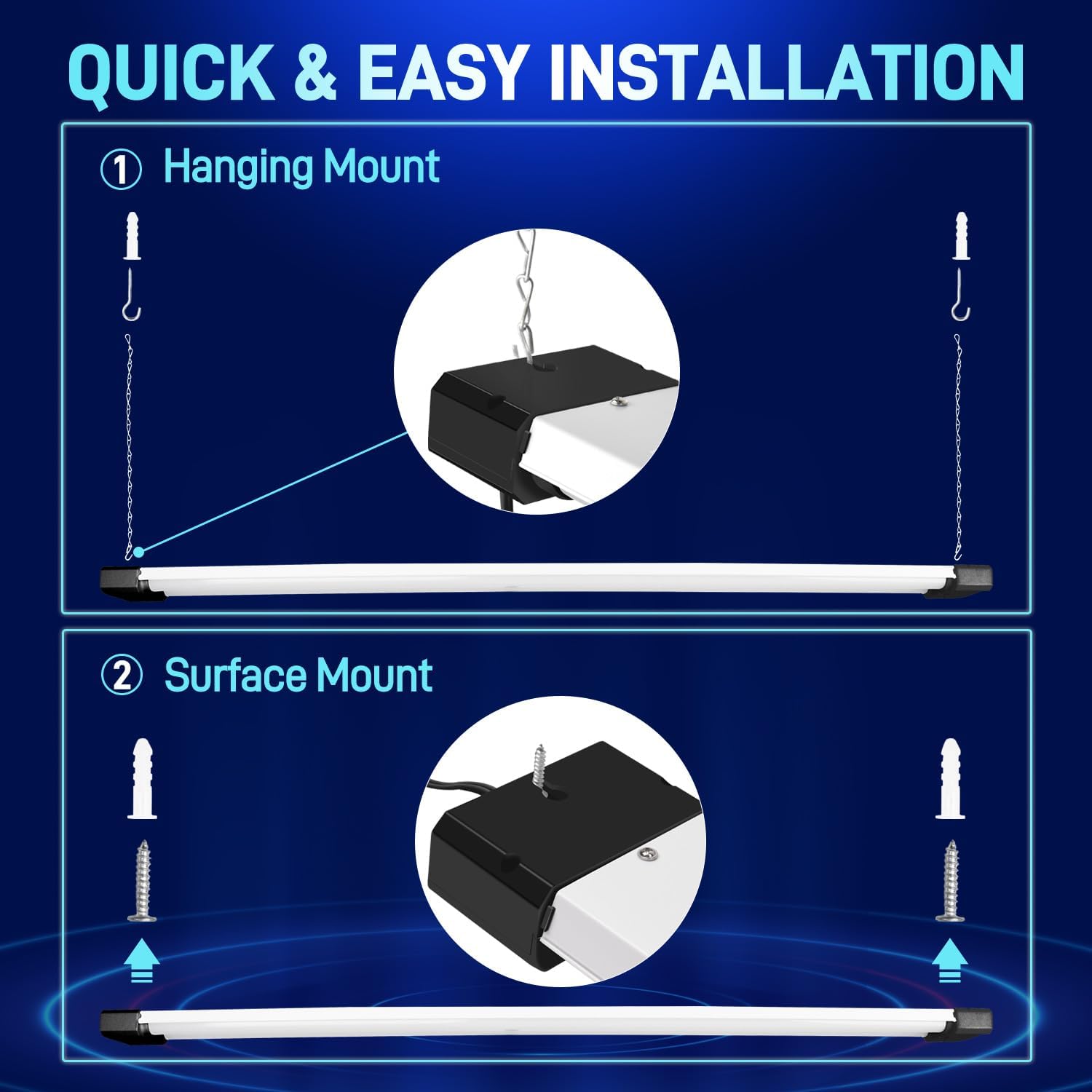 - β Linkable - 4ft linkable shop light use plug connection to connect up to 6 pcs together in your garages, workshops, workbench areas, storage areas, warehouses, basements, equipment rooms, etc.