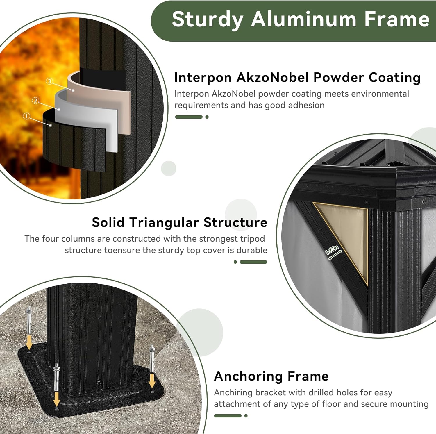 - Solid Aluminum Frame:The metal gazebo has sturdy aluminum frame with more environmentally friendly Interpon AkzoNobel powder coat that is anti-corrosive. Triangle structure with 1.97in angle brace makes it more stable and solid. With 6 inches exceptional snow loading depth, 64-73mph wind resistance, and 99% UV protection with UPF 50+