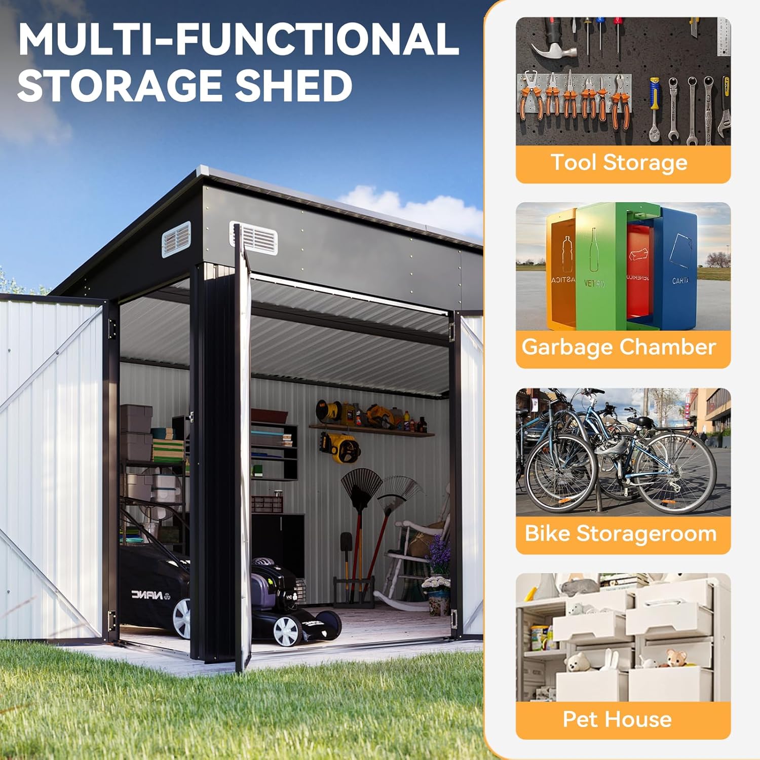- Unique Design and Slopped Roof: Elegant and sophisticated black design makes it more durable. In addition, the metal tool house is designed with a sloping roof that allows it to drain quickly on rainy days to prevent rainwater from accumulating