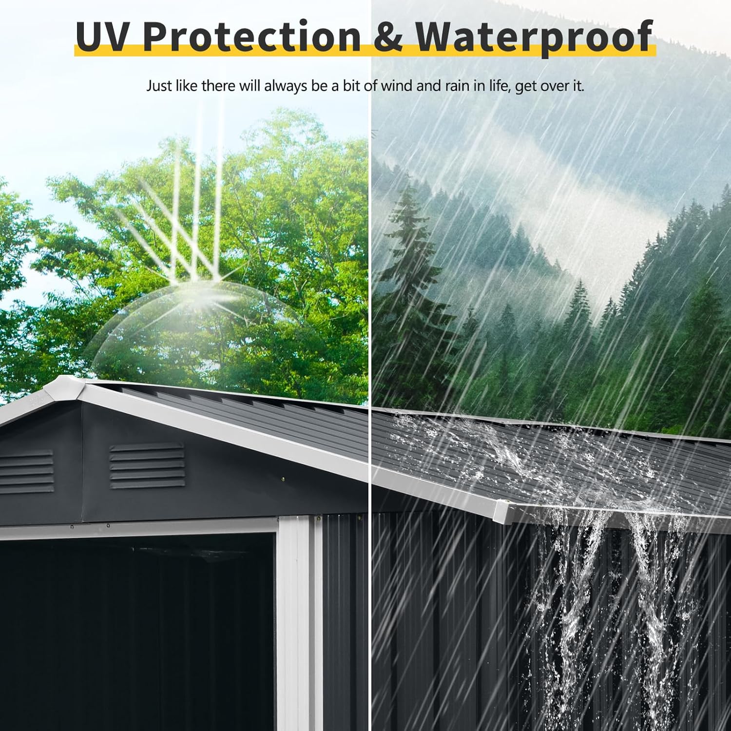 - ๐ก๐๐ฅ๐ฅ-๐ฐ๐๐๐ญ๐ก๐๐ซ ๐๐ญ๐จ๐ซ๐๐ ๐ ๐๐ก๐๐: Our metal shed 6x8 features sliding doors that open and close smoothly, with handles and a heavy-duty lock for added security. It serves not only as a safe space for storing garden tools but also as a warm pet house. The sloped roof of the storage building effectively prevents leaks and snow accumulation, while the four integrated punched vents improve airflow, helping to keep your items dry.