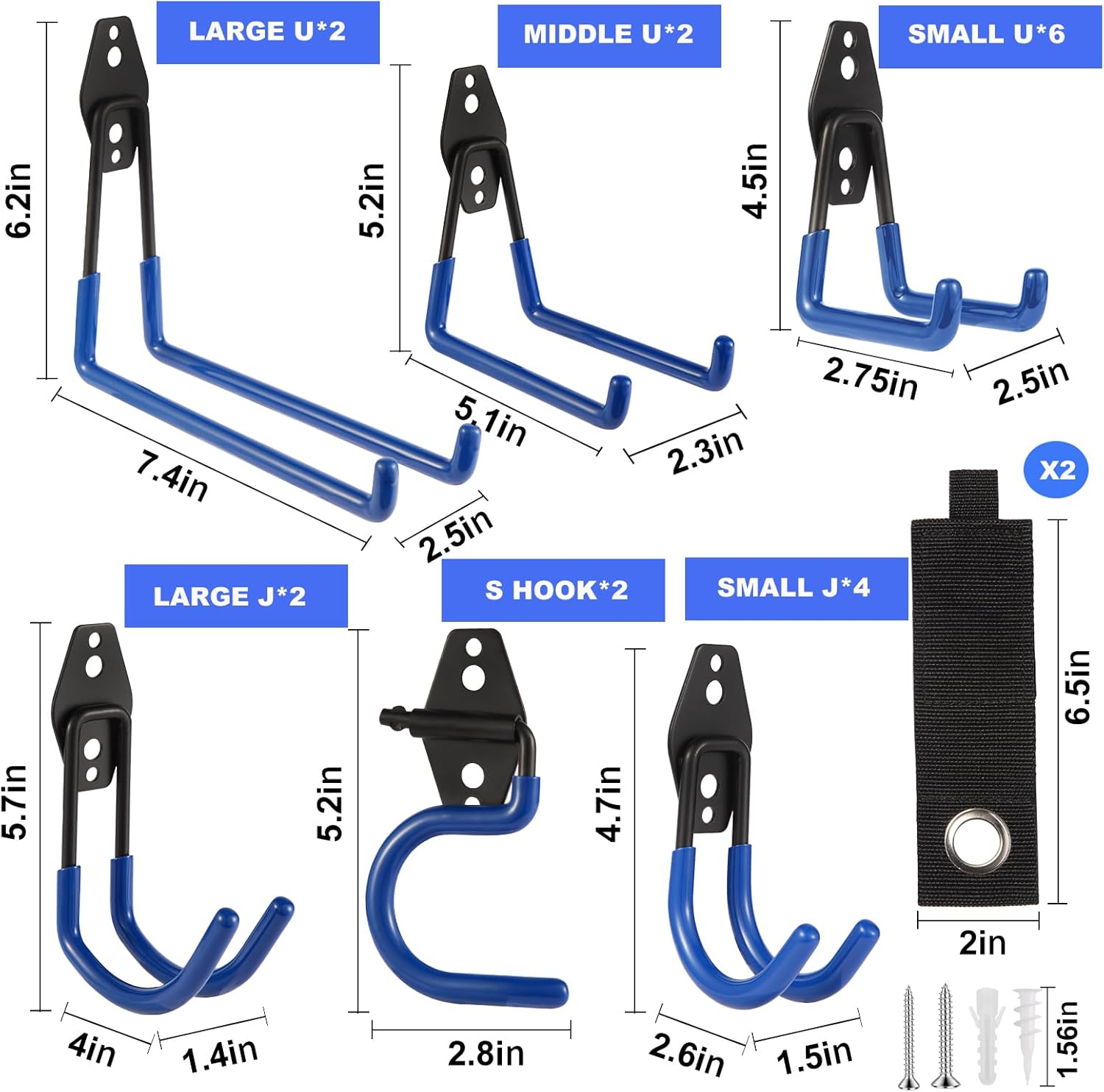 - ZexHok Wall Hook Assortment Set: 20 pack storage hooks organizer include with 6 sizes: 4pcs small J hooks, 6pcs small U hooks, 2pcs large J hooks, 2pcs middle U hooks, 2pcs large U hooks, 2pcs S hooks and 2pcs straps for hanging tools of different sizes and weight.