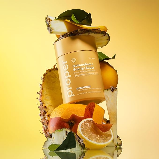 Proper, The Yellows Metabolism and Energy Boost, Sugar Free Energy Drink Powder with 100mg Caffeine. No Creatine or Beta-Alanine. 30 Servings, Pineapple Mango Drink Mix for Men and Women