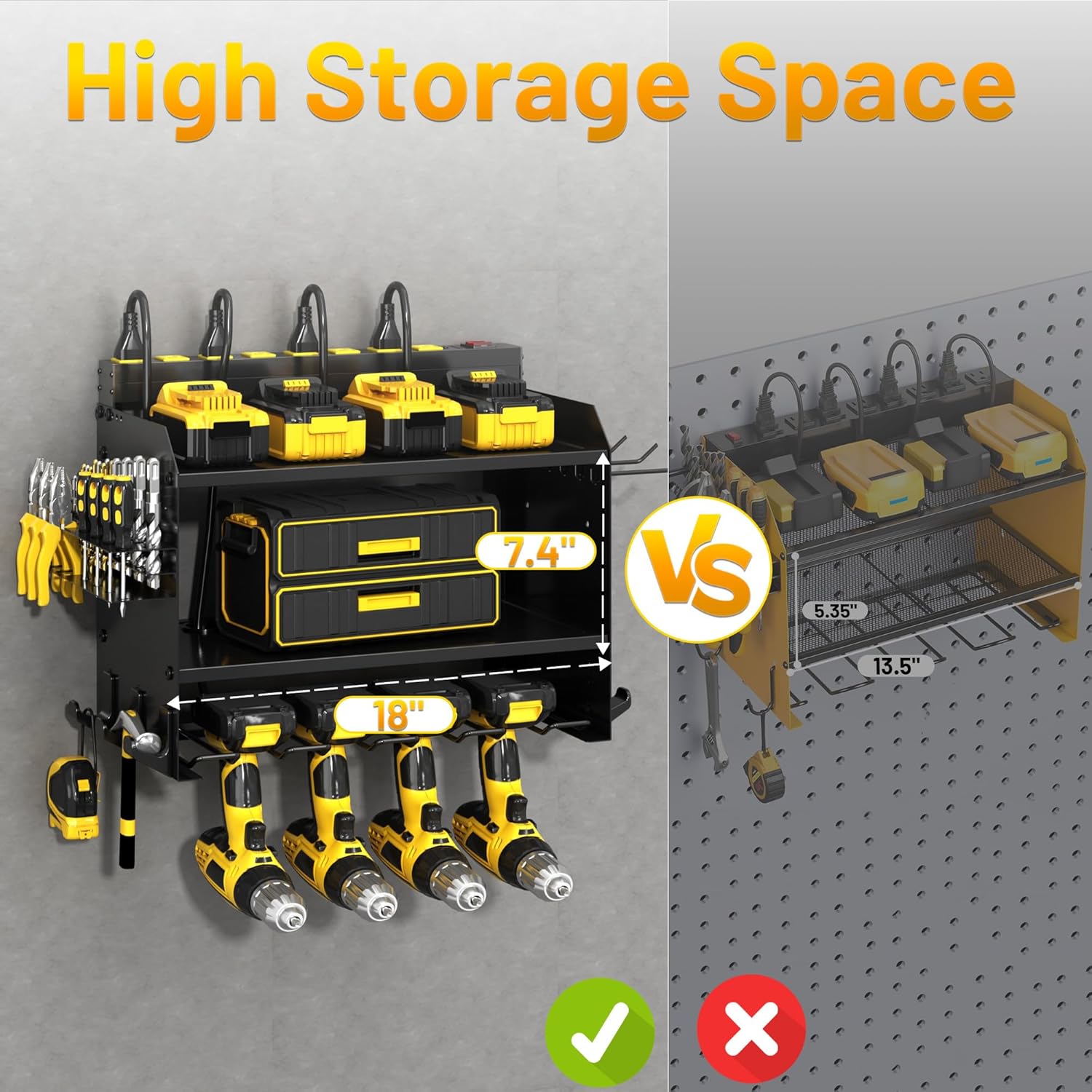 - WALL TOOL ORGANIZER:Power tool organizer wall mount utilizes free wall space to store tools,comes with charging station,4 drill holder slots and 9 hooks o keep your rechargeable tools in order,providing you with a clean and efficient workstation