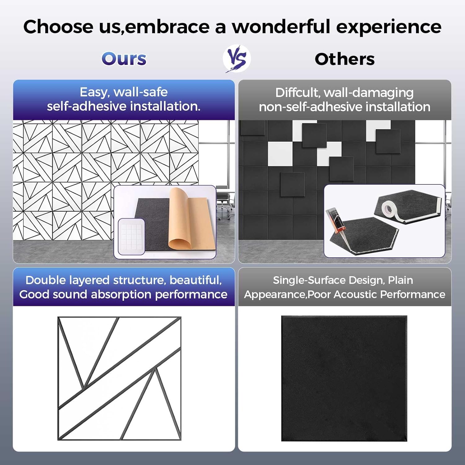 - Widely Applicable: Acoustic panels self adhesive size: 12" x 12" x 0.43", and the thickness is 8% thicker than the traditional thickness, it can provide more effective noise blocking and is suitable for a variety of high-demand environments. Suitable for home theaters, professional studios, music rooms, It can effectively improve the audio effect and enhance the work and entertainment experience in various places such as game rooms, bedrooms, offices, etc.