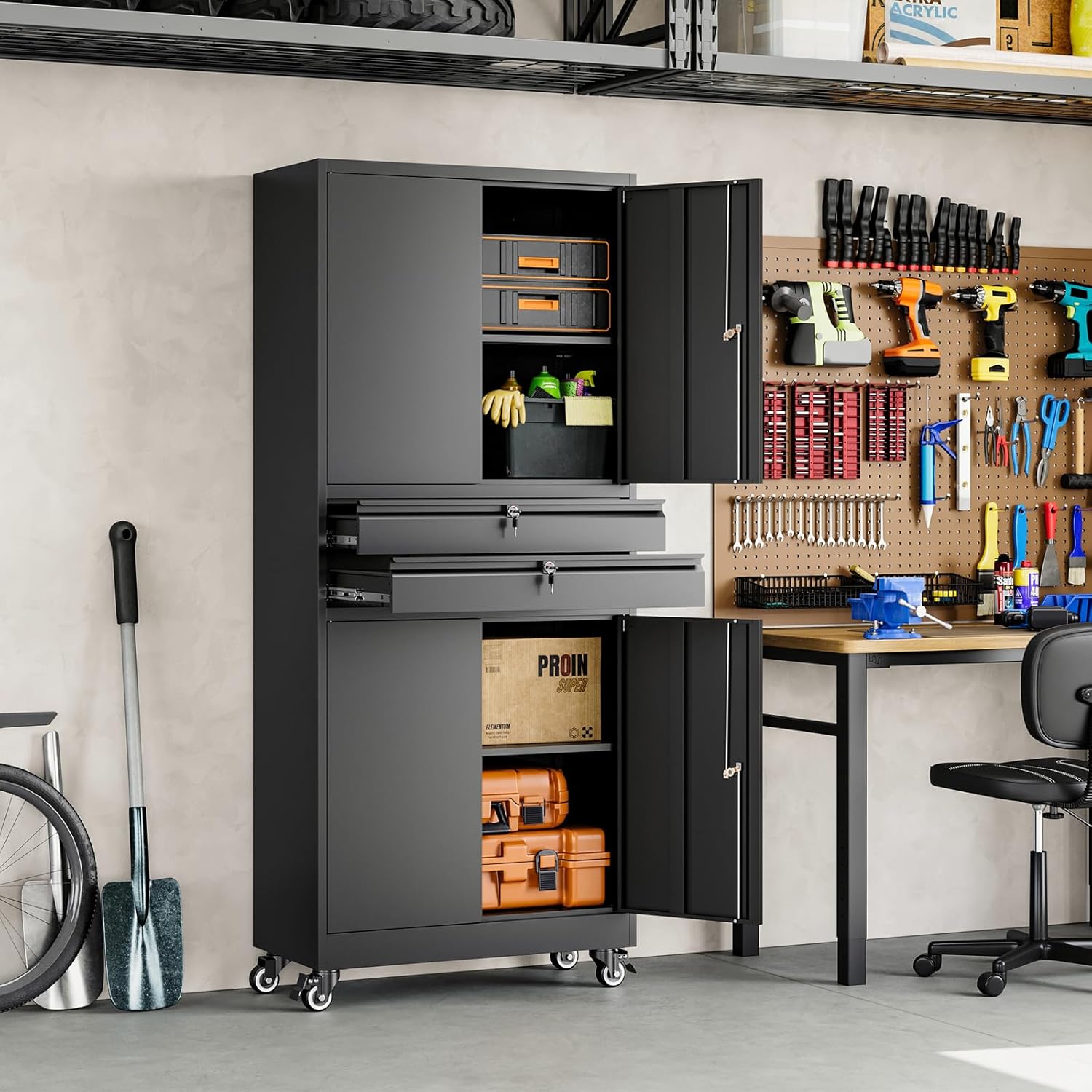 Yizosh Metal Garage Storage Cabinet with Locking Doors and Adjustable Shelves, 74" Rolling Tool Storage Cabinet with 4 Wheels and 2 Drawer for Garage,Warehouse