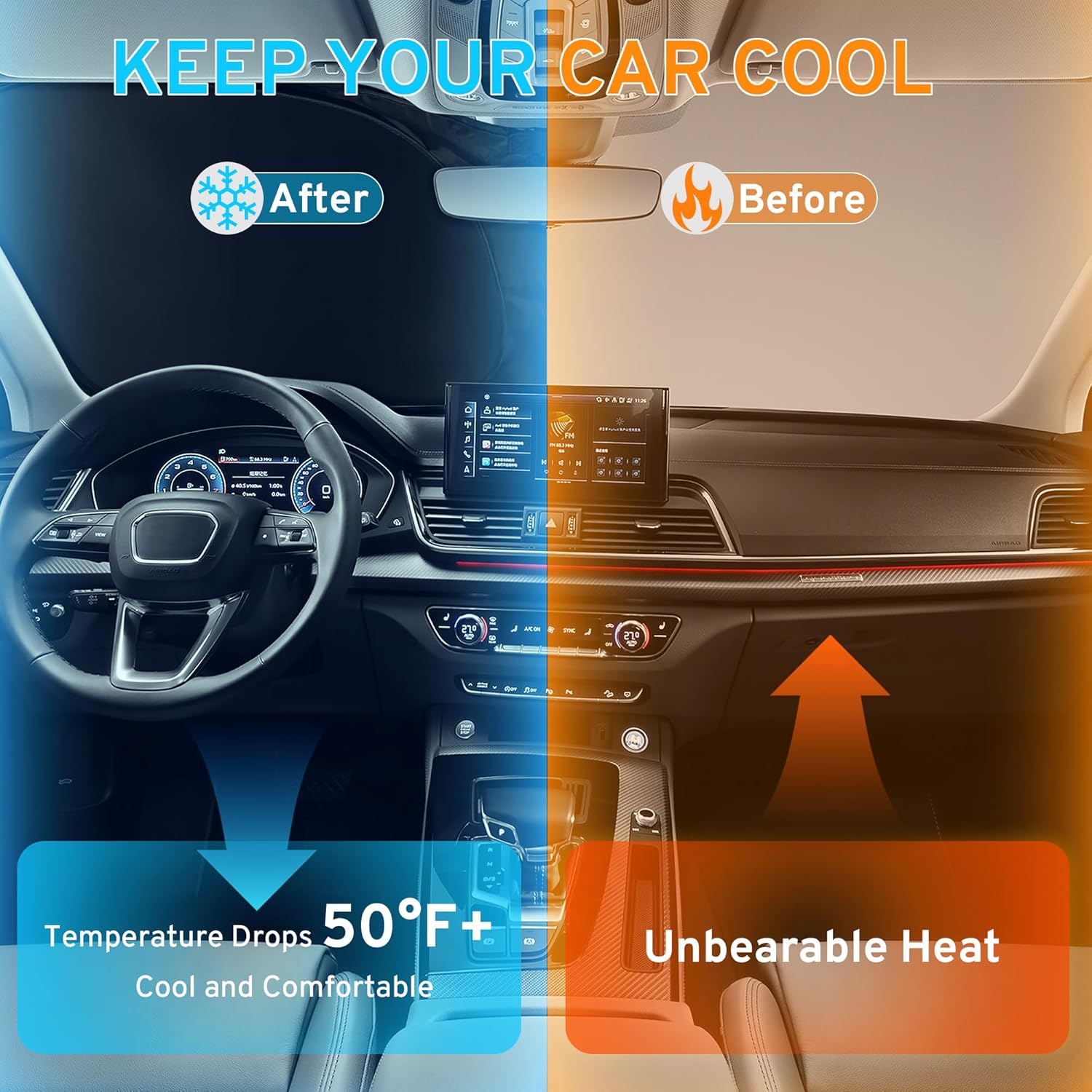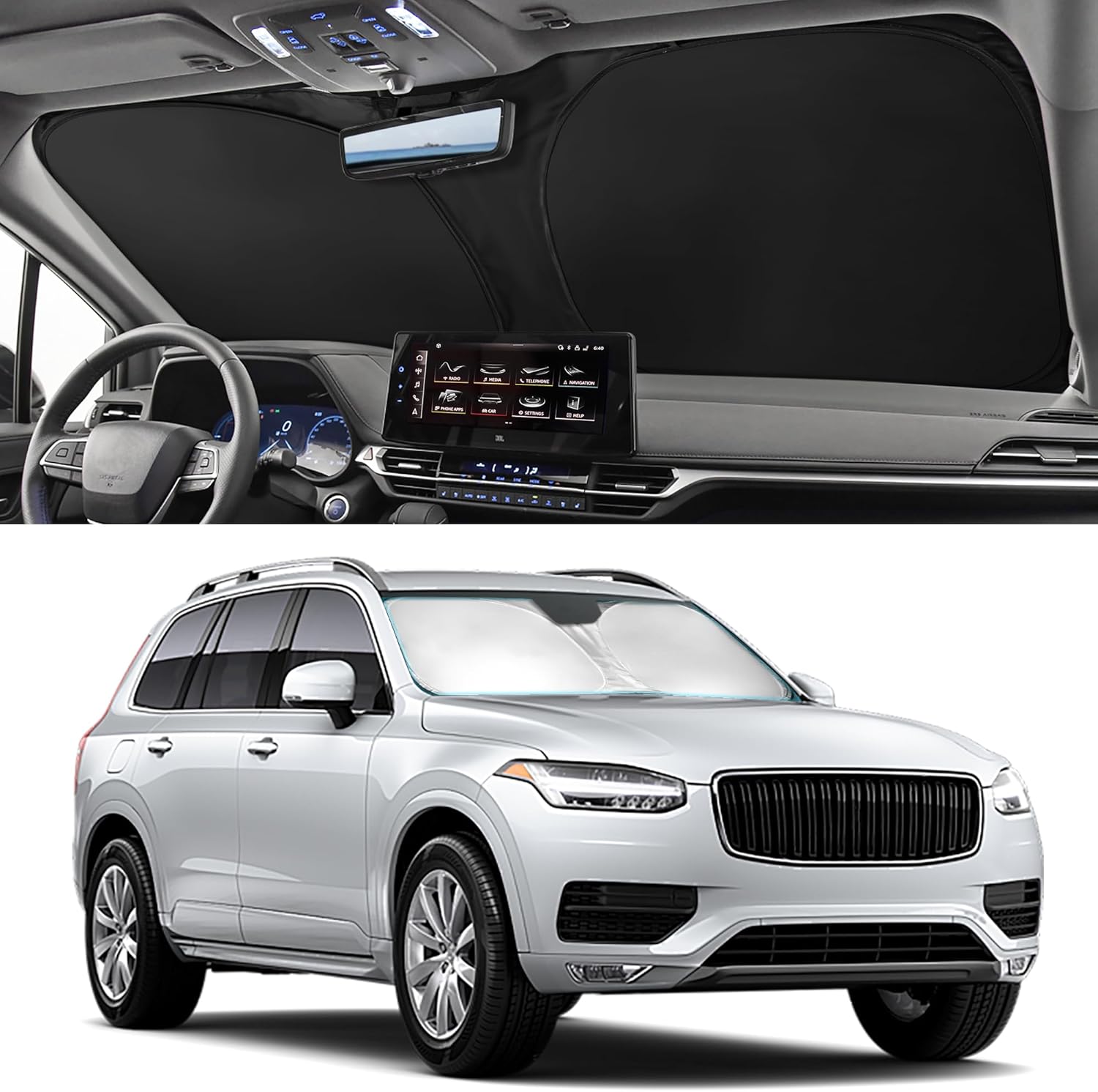 - 【Easy to Install】: Our sun shade is easy to install without tools, you can use the two car sun visors to hold it in place by pressing down on them. Installation takes just a few seconds and is truly easy to use (Please refer to our installation&storage video).