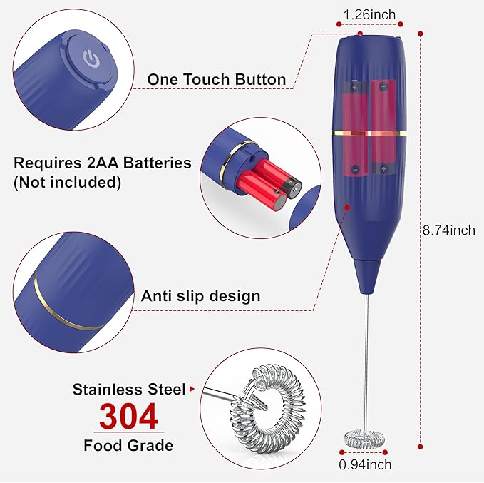 Handheld Milk Frother 14,000 RPM Drink Mixer Wand with Stand & Stirring Spoon Quiet One-Button Operation, Non-Slip Handle, Detachable Whisk Head for Coffee, Lattes, Cappuccinos, Matcha (Blue)