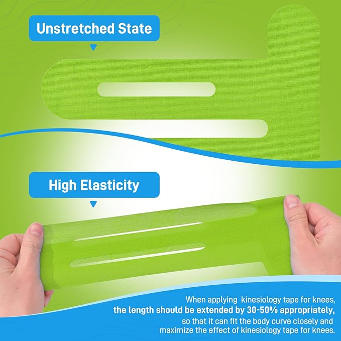 - 【Increase Support, Strengthen and Stabilize the Knee Joint】Kinesiology tape for knees is a functional muscle tape designed for various sports, especially for outdoor sports. Knee tape is mainly used to increase support, strengthen and stabilize the knee joint, improve incorrect movement patterns, effectively limit the range of motion of athletes' joints and muscles, prevent muscle strain, and relieve pain that may occur during exercise.(Green 20pcs)