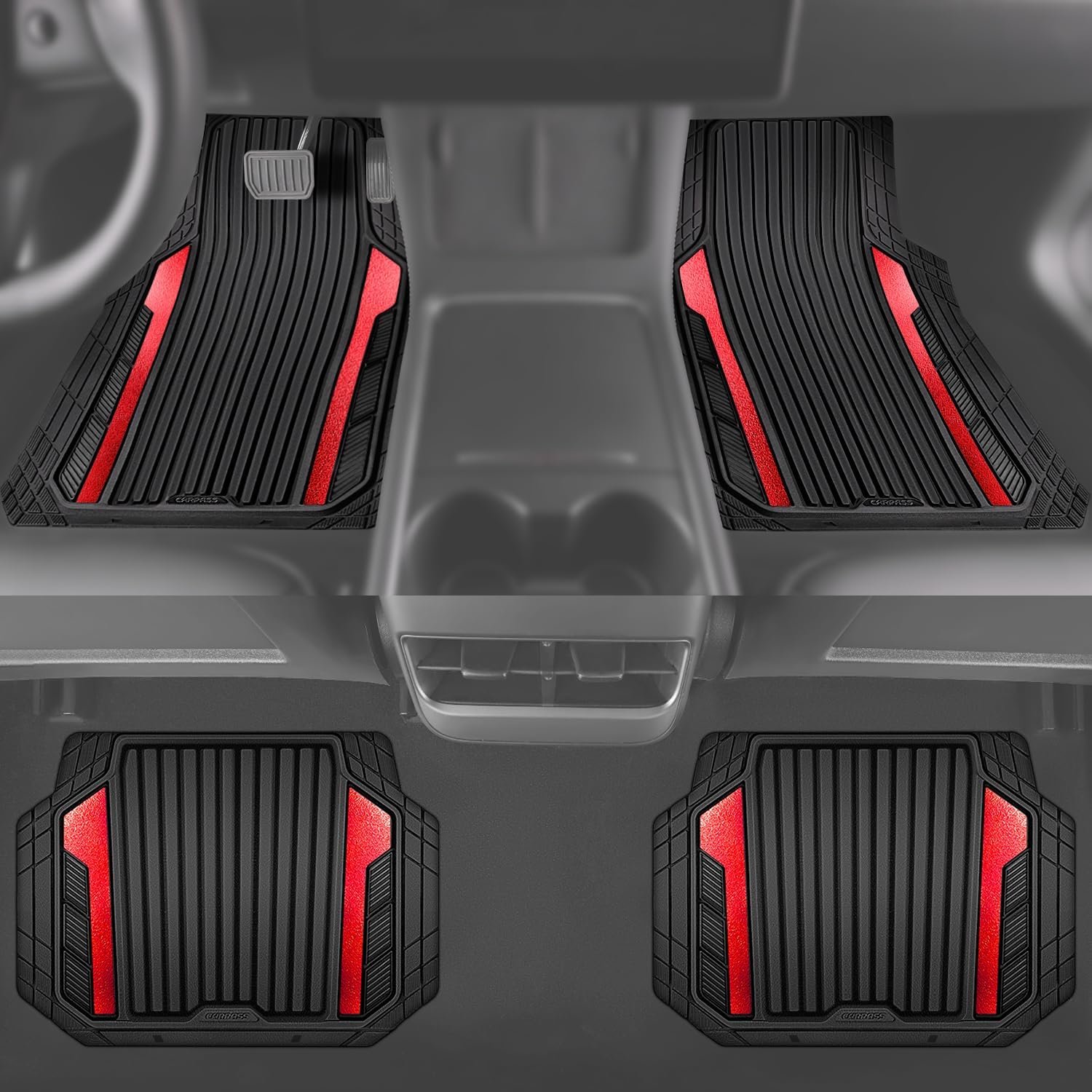 CAR PASS Heavy Duty Rubber Car Mats Metallic S~L Size, Aluminum Film All Weather Floor Mats Waterproof Universal Trim to Fit SUV Sedan Van Truck 4 Piece Deep Dish Two-Tone Sporty Black Red Chrome