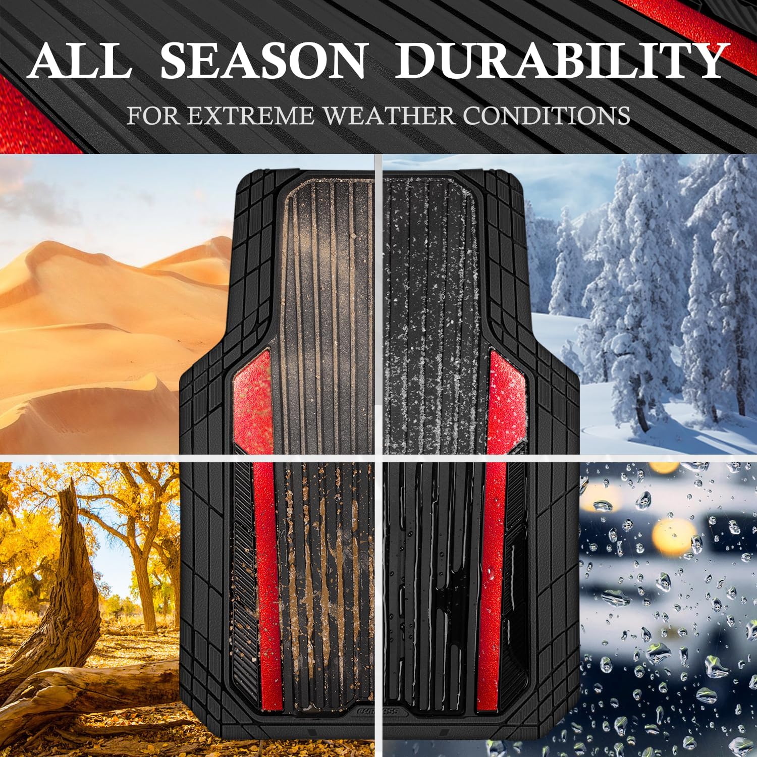 - ăAll Weather All Season ProtectionăChrome metallic aluminum film heavy duty rubber car mats use for all season.Ridge channels specifically design to prevent fluids from leaking onto carpets,the deep channels also trap any mud, dirt, water or snow that gets in your car.