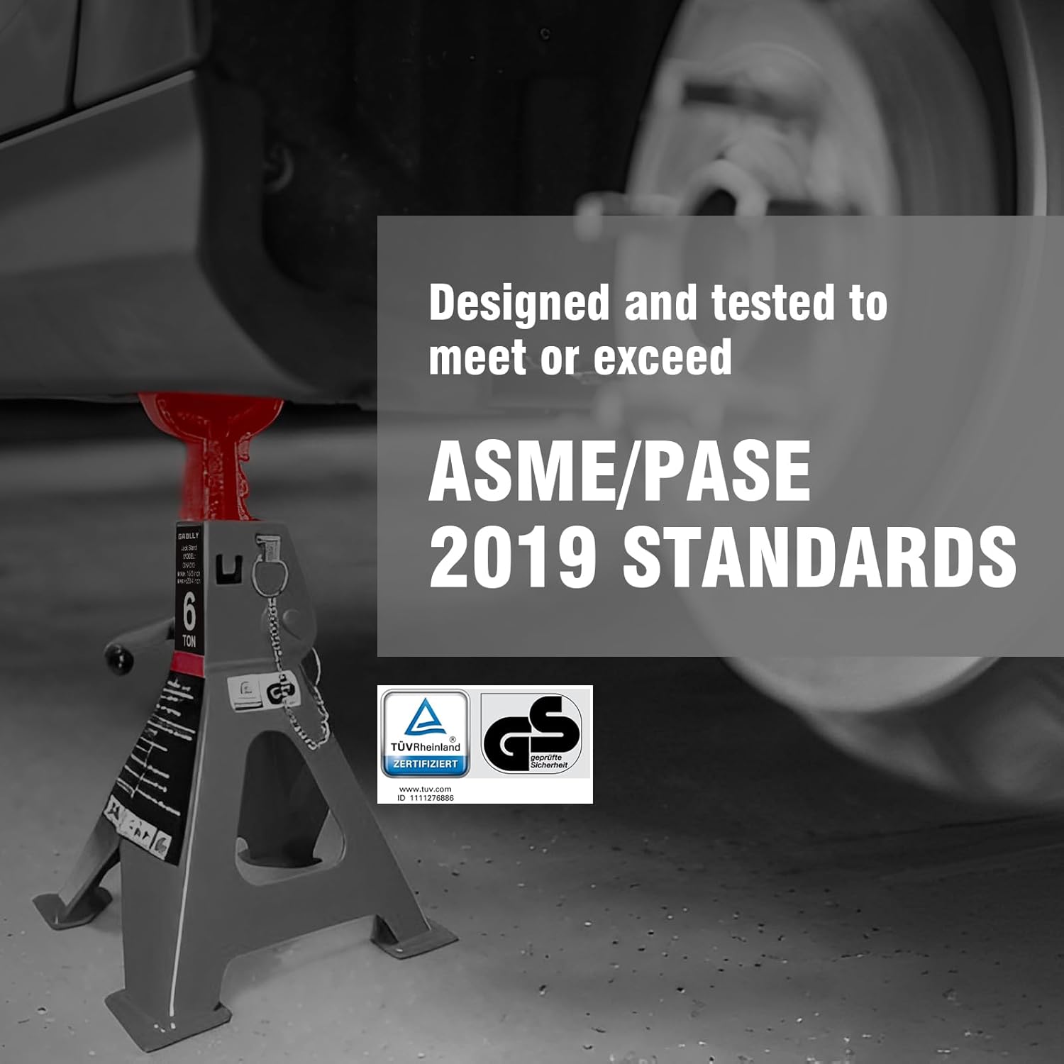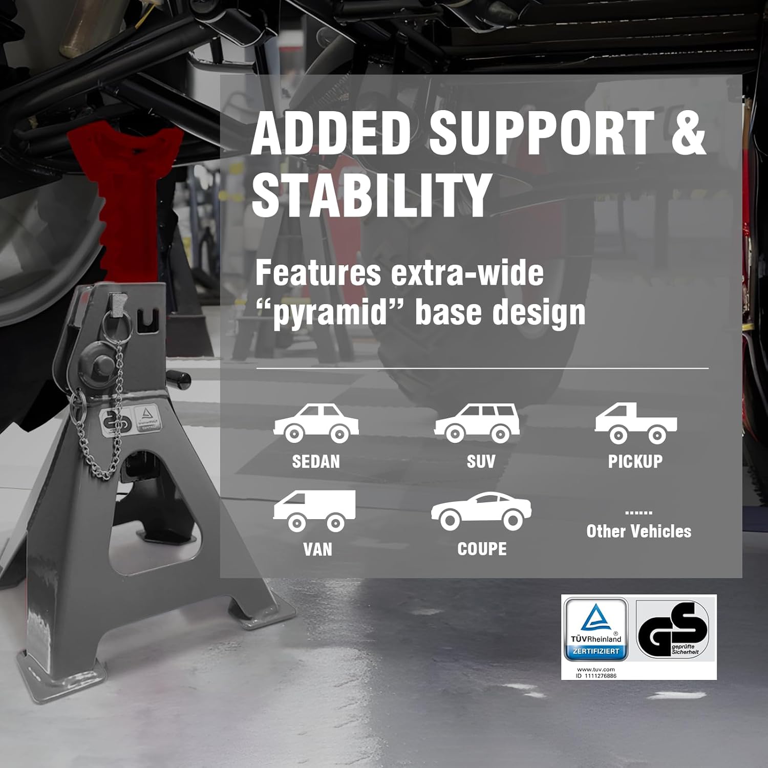 - Sturdy and Safe to Use: Double locking jack stands help support vehicles after lifting with a jackincluding a limited 1-year manufacturer warranty and meeting US safety standards.