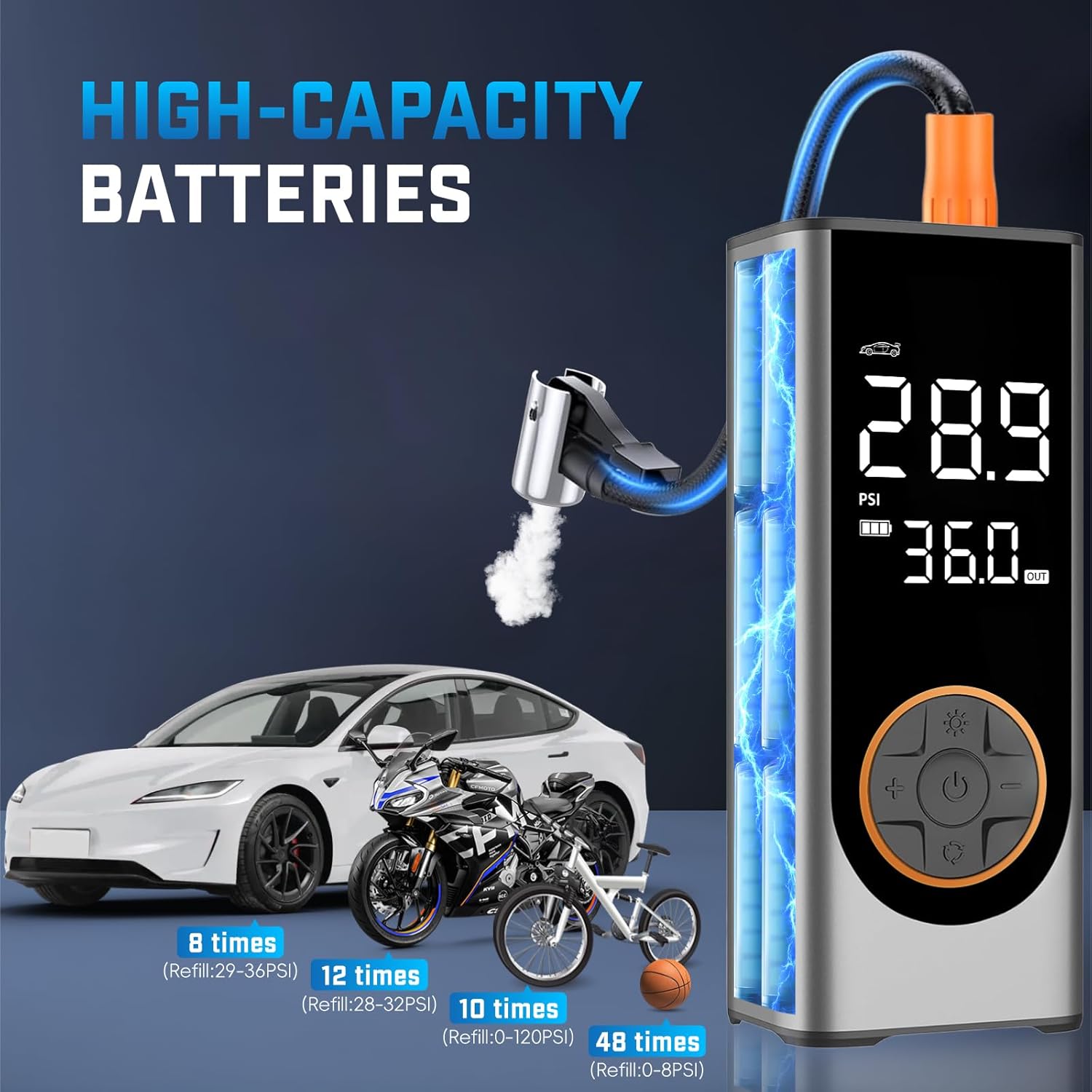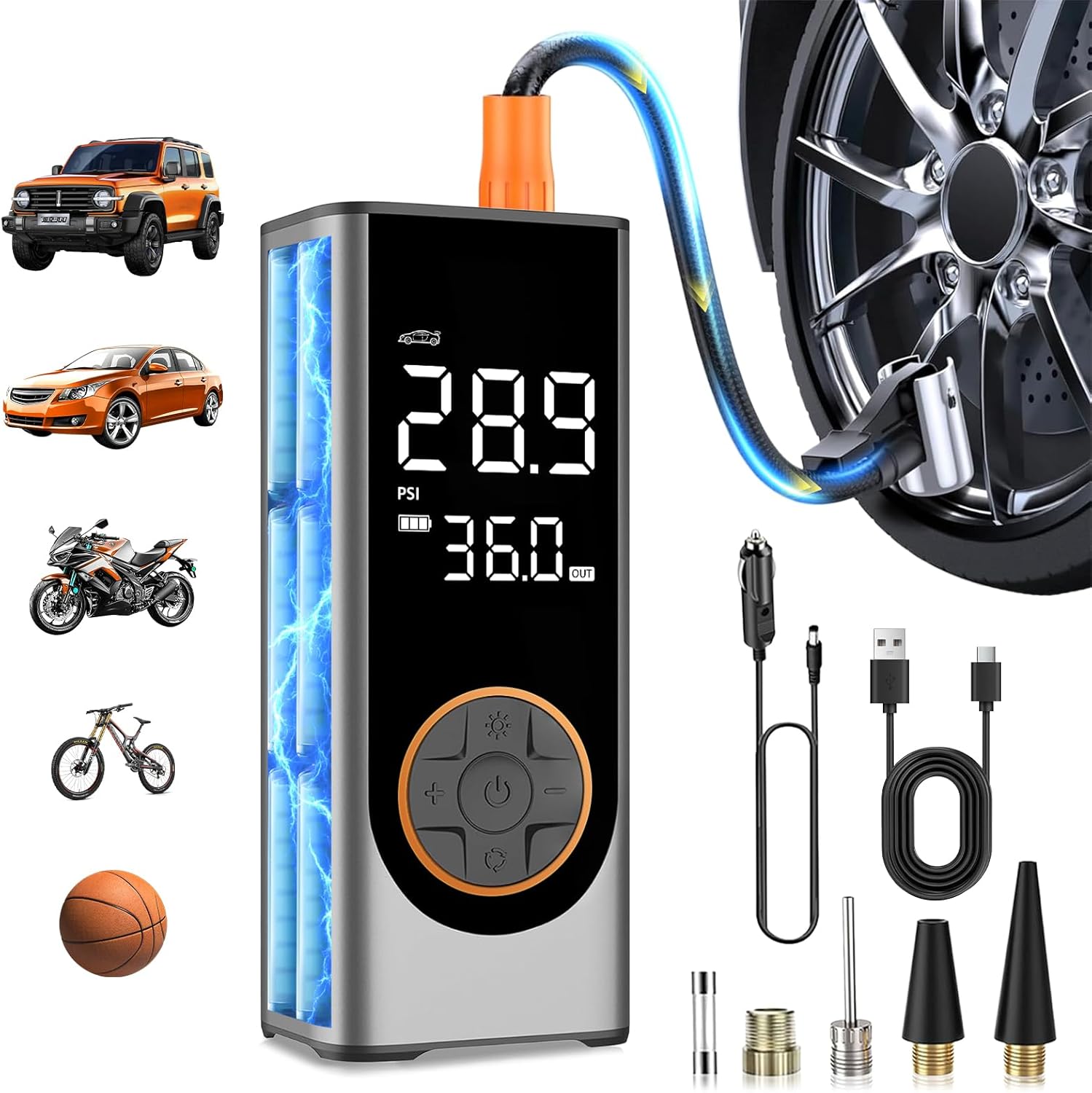- π 4X Fast Inflation & 5 Modes: This tire inflator portable air compressor delivers a maximum 150 PSI & 35 L/min airflow, inflating a car tire (29-36 PSI) in under 1 min. Features 4 preset modes: car, motorcycle, bike, and ball.