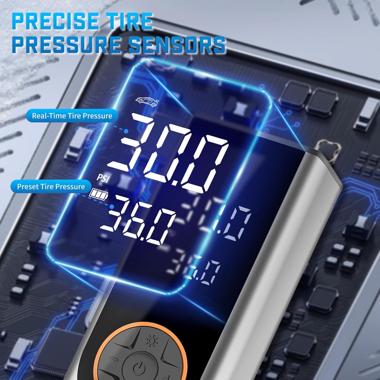 - β¨ Accurate Dual Pressure Display: Featuring a clear display screen, the portable air compressor shows real-time and preset pressure values, automatically shutting off when the preset pressure is reached. Four pressure units: PSI, KPA, BAR, KG/CMΒ².