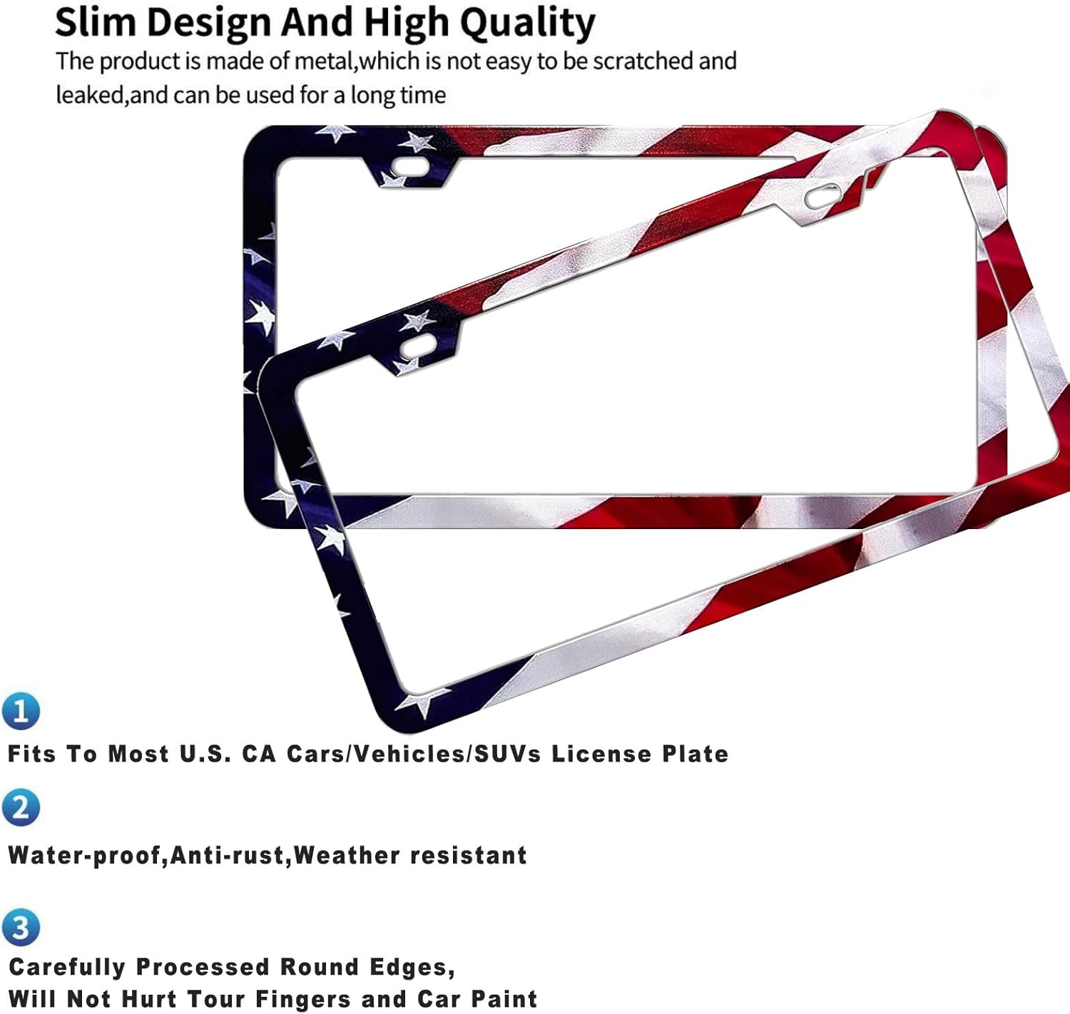 - STYLISH DESIGN: american flag license plate frame 2 pack Features an elegant, feminine aesthetic that enhances your vehicle's appearance while securely holding your license plate