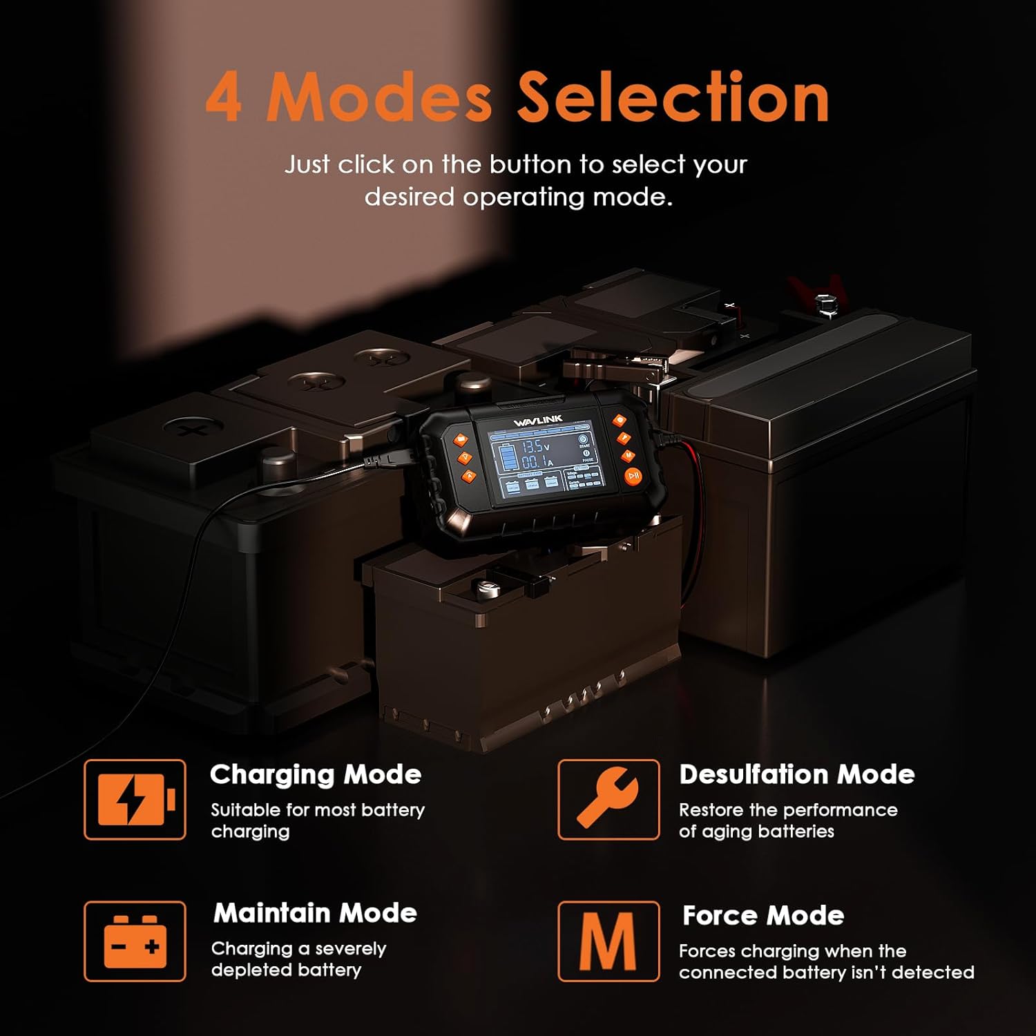 - ⚡【Intelligent & Safe Charging】This advanced battery charger features four charging modes, including Charging, Maintain, Desulfation and Force modes. The multi-stage charging capabilities incorporates functions such as battery test, soft start, fast trickle charging, and more. These processes ensure optimal performance and longevity for your batteries by providing comprehensive monitoring and protection throughout the charging cycle.