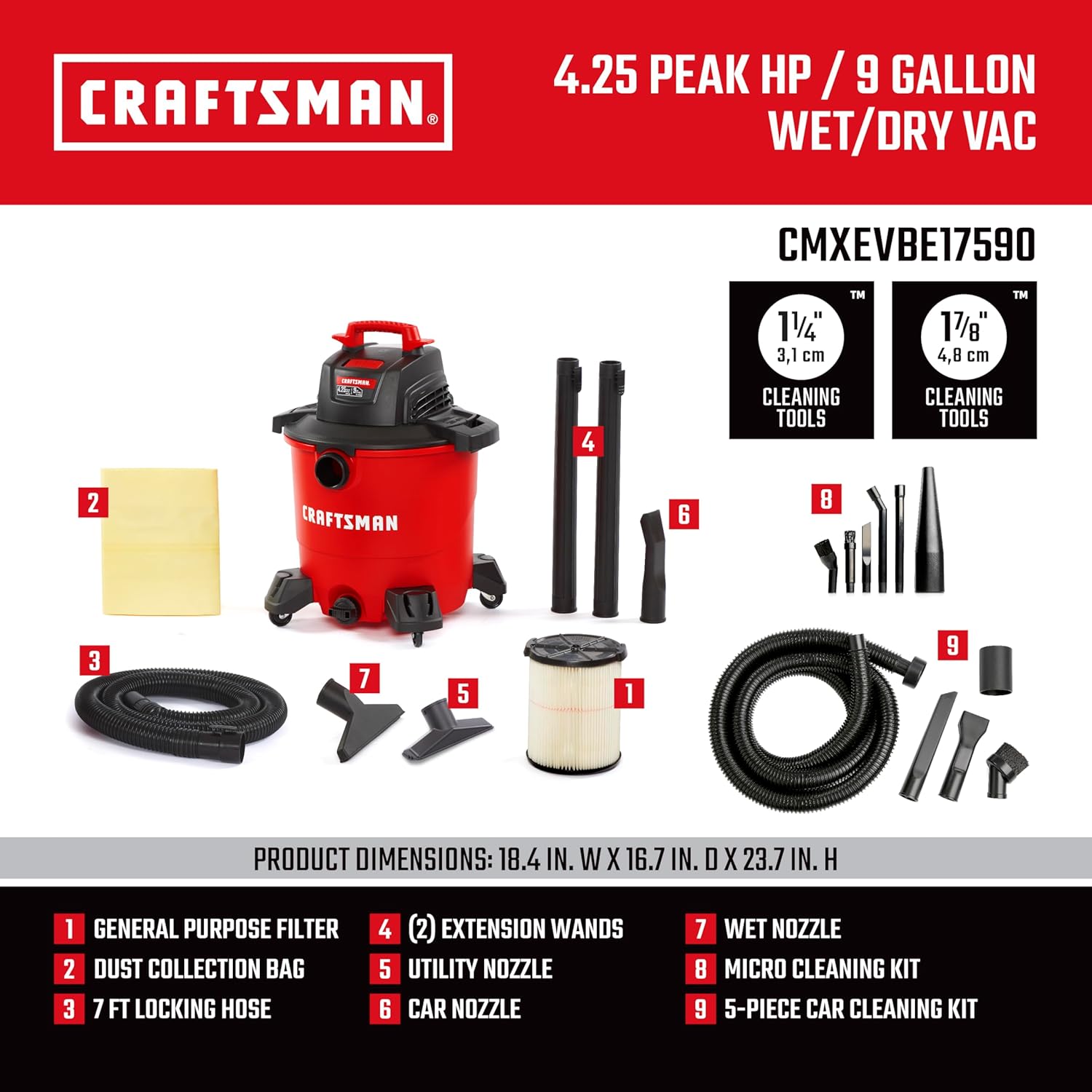 CRAFTSMAN CMXEVBE17590 9 Gallon 4.25 Peak HP Wet Dry Vac, Portable Shop Vacuum Wet and Dry with Filter, Dust Bag, Hose, Car Cleaning Kit and Micro Cleaning Kit for Home and Garage Cleaning