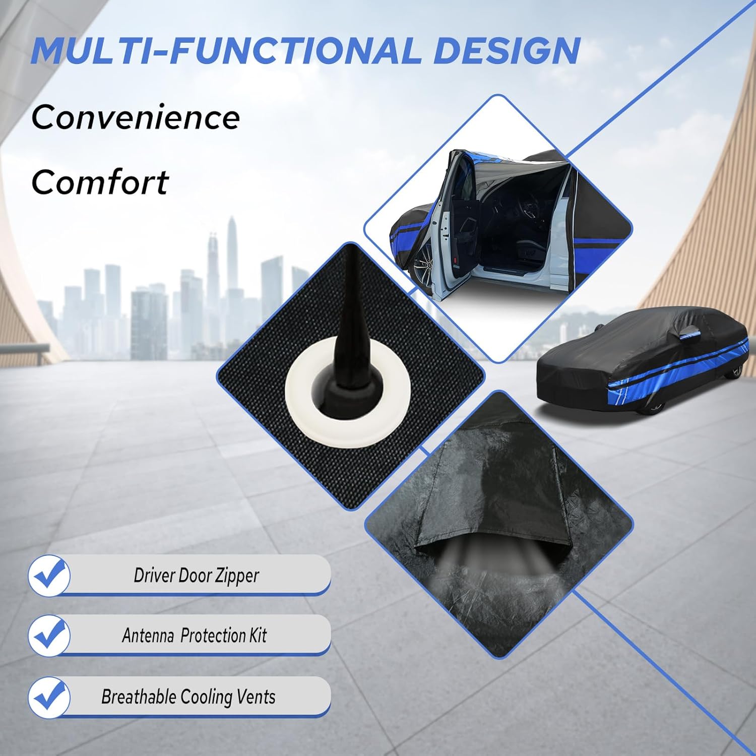 - ăMulti-functional Designă1. The Toyota Corolla car cover has three snap-on reinforced windproof belts in the front, middle, and back to resist strong winds. 2. There is a door zipper on the driver's side for easy access to items. 3. The unique reflective strip design reminds others at night to ensure parking safety. 4. There are vents on the side of the car cover to prevent internal moisture accumulation and keep it dry, allowing for faster ventilation in summer. 5. There is a front logo on the front side of the Toyota Corolla car cover, which can quickly identify the front and rear during installation.