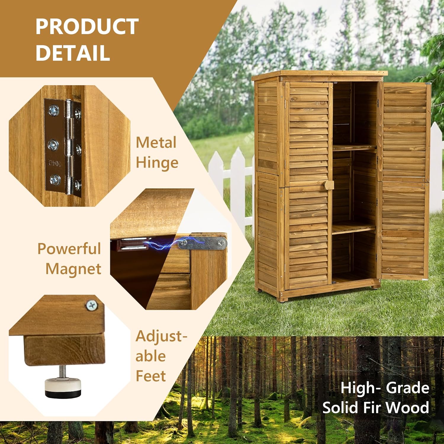 - Durable and Weather-Resistant - Made of solid fir wood with a natural wood finish, this storage shed is built to withstand harsh weather conditions. Its sturdy structure ensures long-lasting durability for outdoor use.