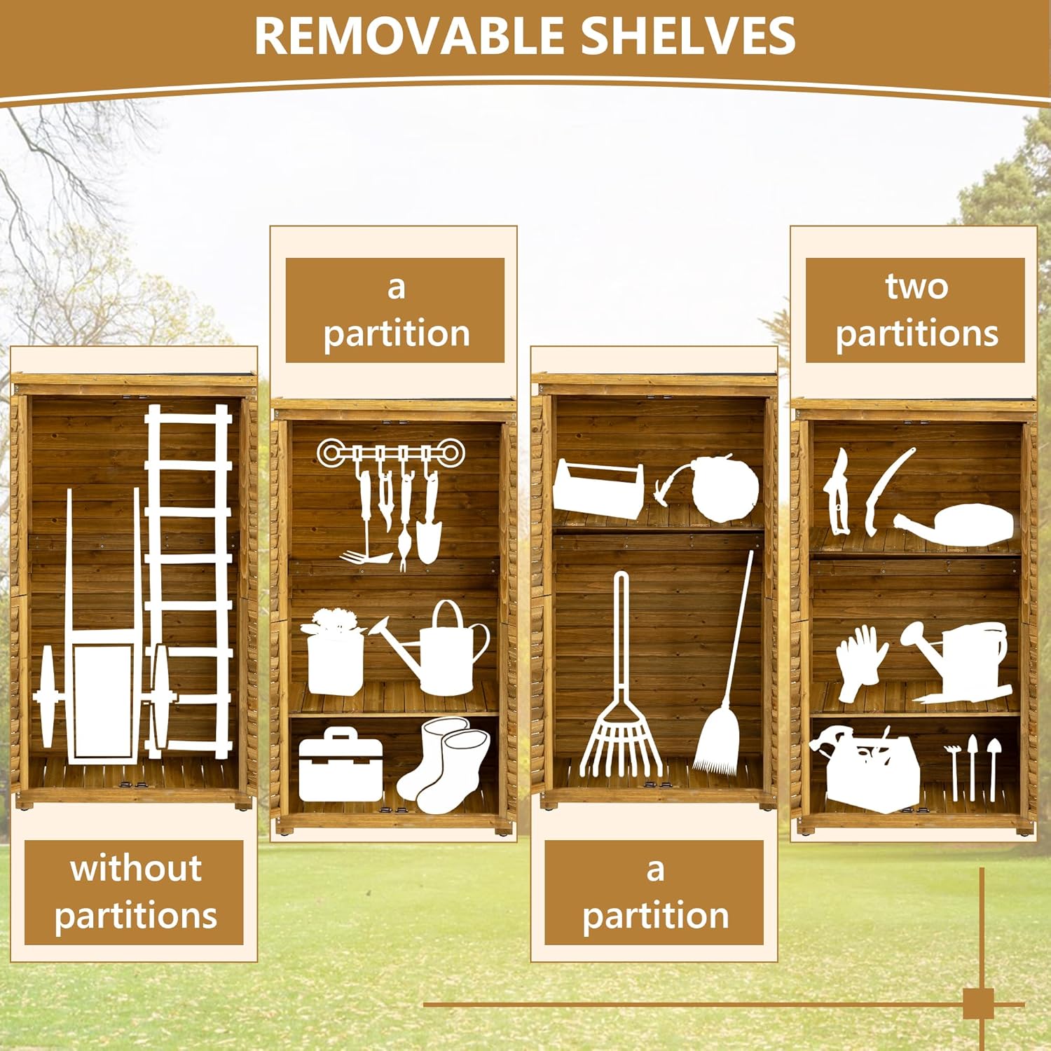 - Versatile Storage Space - This outdoor wooden storage cabinet comes with 2 removable shelves, offering 3 spacious layers to organize gardening tools, pool supplies, and equipment efficiently. Keep everything tidy and easily accessible.