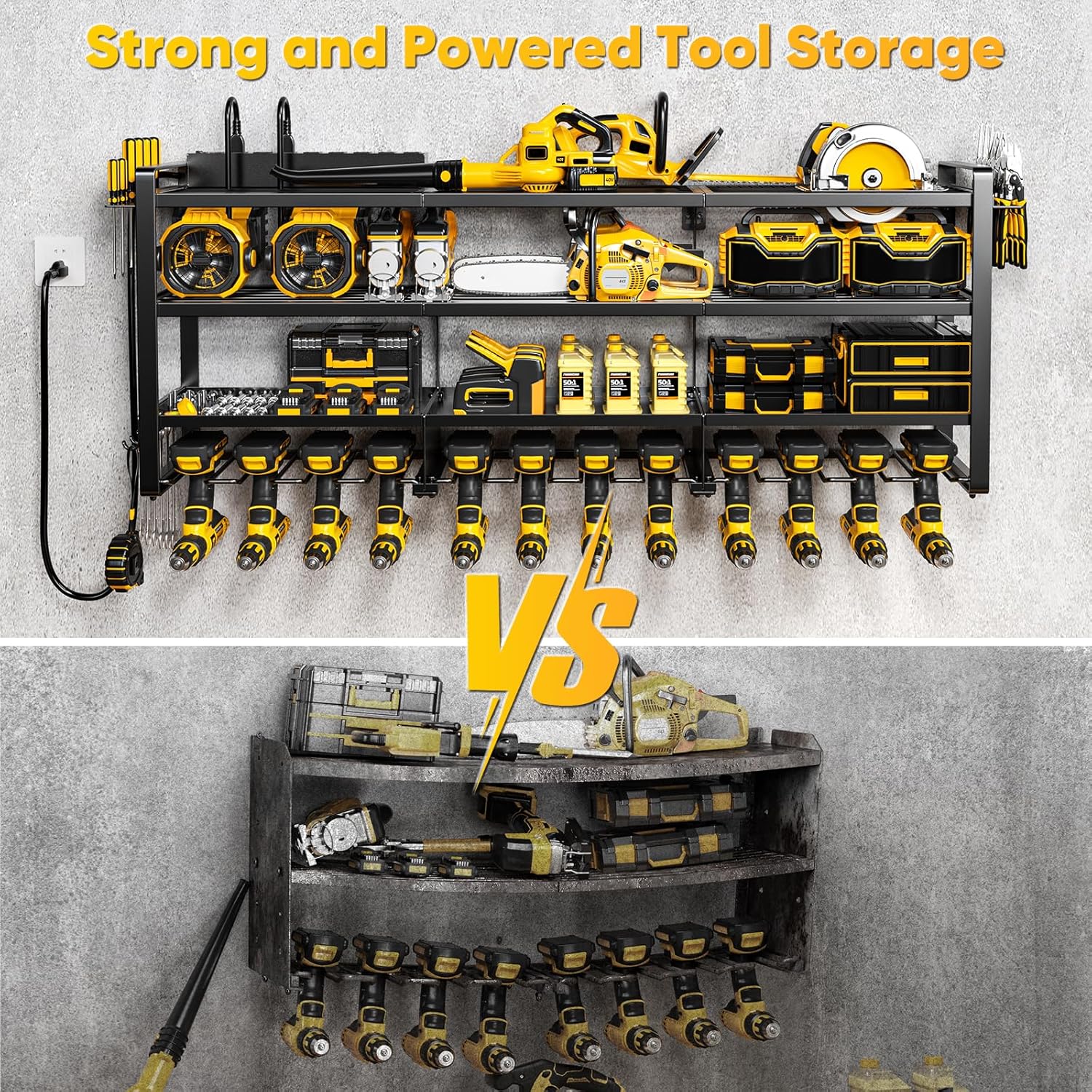 49.5" W Large Power Tool Organizer Wall Mount with Charging Station, 4-Tier Heavy Duty12 Cordless Drills Holder Load 600 lb, Tool Battery Storage Rack Built in 8 Outlet Power Strip for Garage