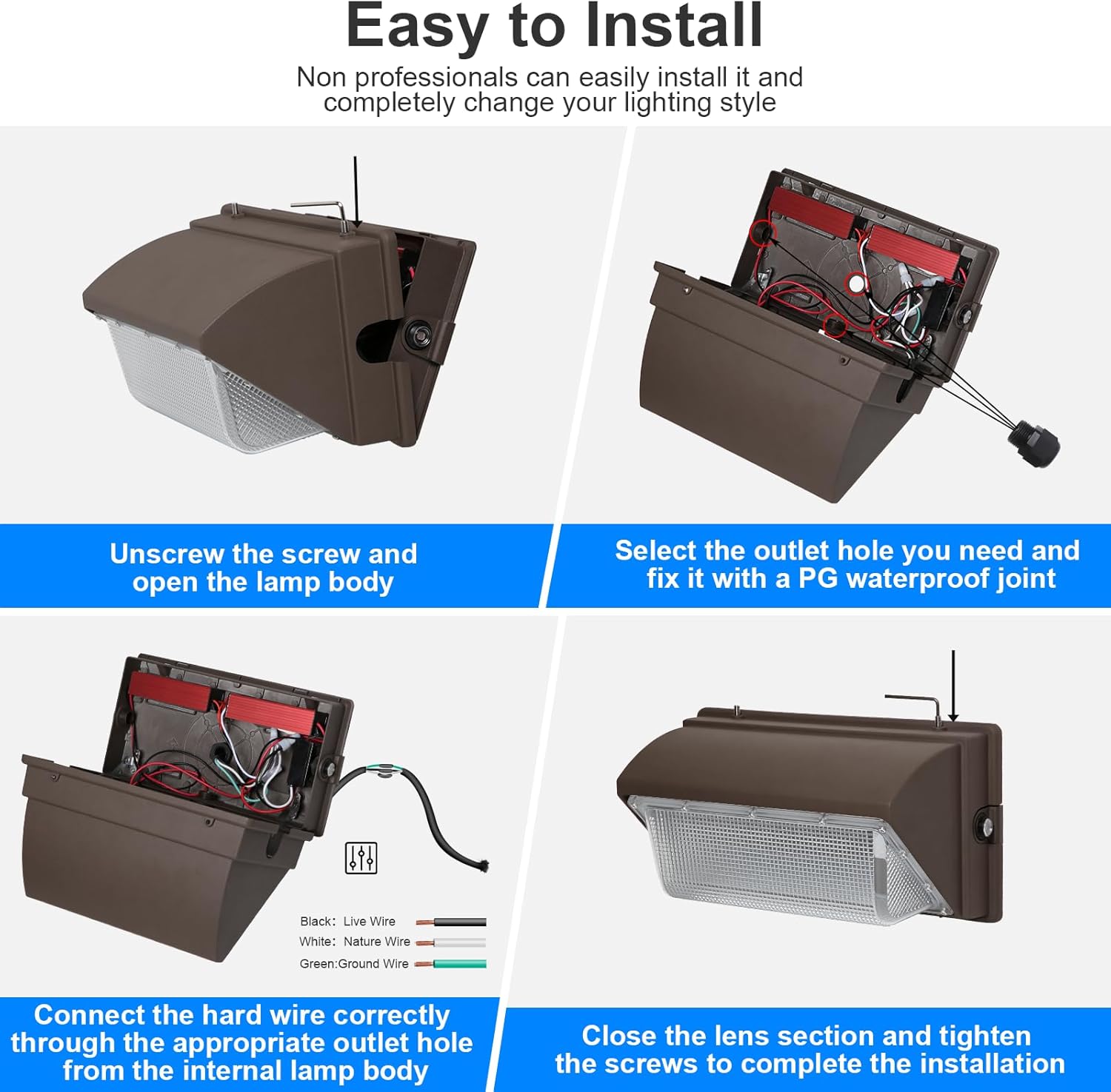 - Intelligent Dusk to Dawn - Wall pack led lighting dusk to dawn equipped with an efficient built-in driver and photoelectric tube control system, it can automatically turn off at dawn and on at dusk, making it convenient for energy-saving intelligent area lighting management and improving your usability