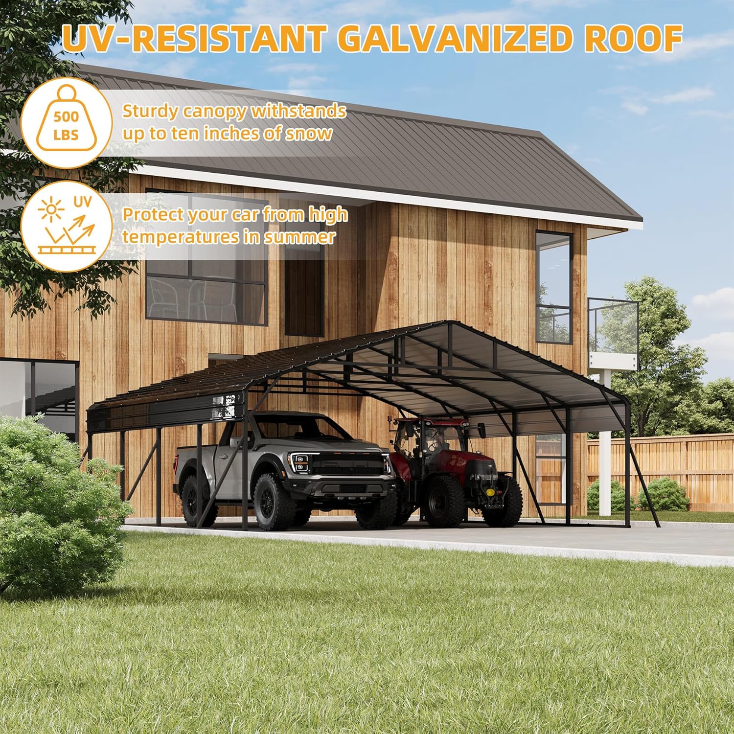 - UPGRADE STURDY FRAME - Different from traditional canvas carports, this upgraded 20'x20' metal carport has a galvanized steel roof and a powder-coated steel frame. Its upgraded frame structure has been tested rigorously over 1000 times, offering a 35% better ease of installation and stability compared to others