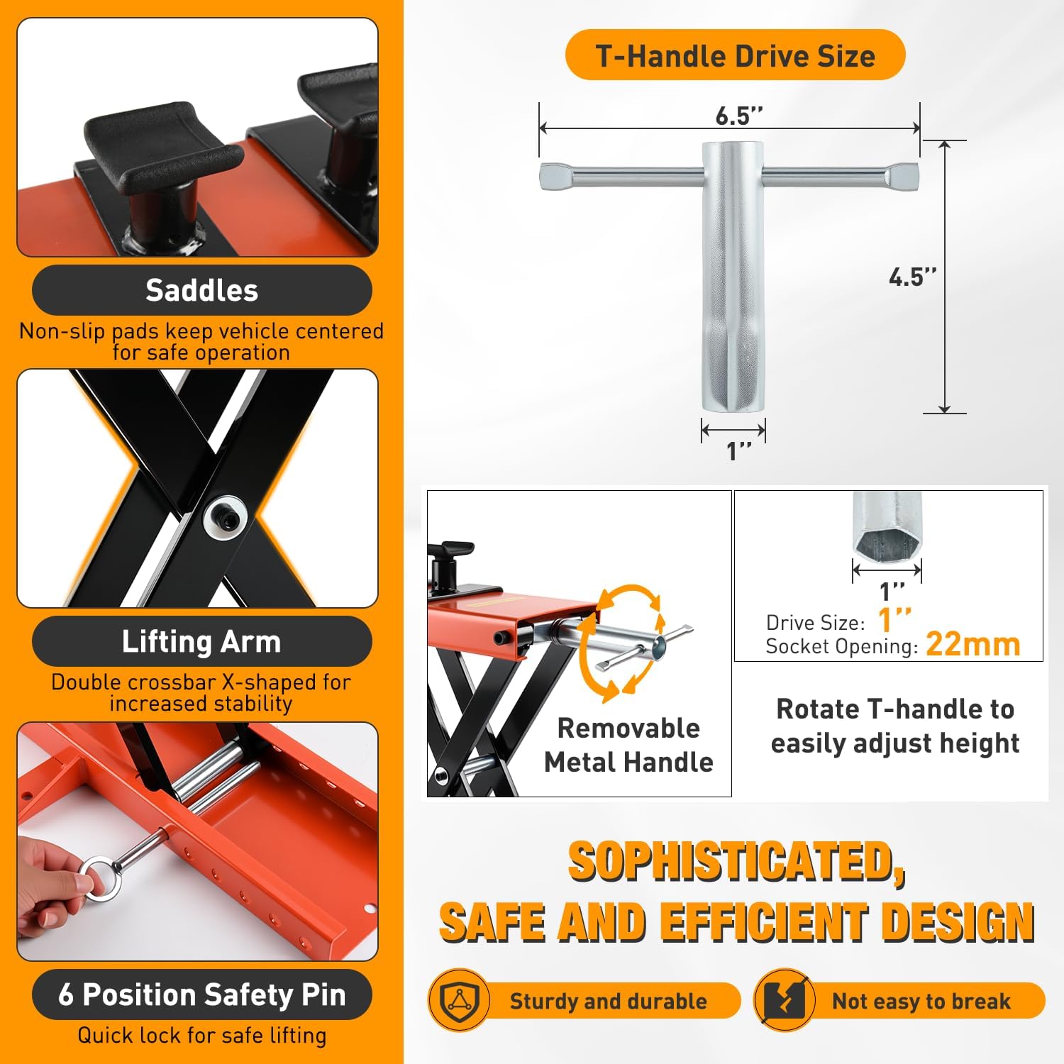 - POWERFUL MOTORCYCLE LIFT: Nilight orange motorcycle scissor jacks can safely handle up to 1100 lbs / 0.5 tons. This heavy duty motorcycle jack will help you lift motorcycles or dirt bikes with ease, fit for Harley Davidson and more motorcycle. Great for use in the garage, shop or track for your repair or cleaning