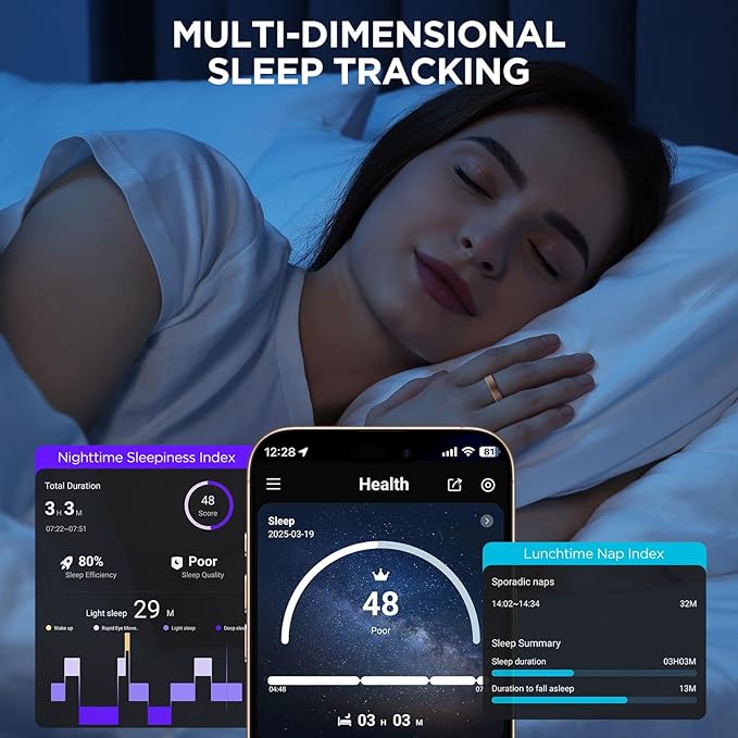 - Excellent Sleep Monitoring: This sleep tracker ring can automatically monitor your sleep (include night sleep and naps). Monitor the bedtime, wake-up time, eye movement time, sleep quality (deep sleep and light sleep). You can view detail sleep data in the app to help you better adjust your habits and improve sleep quality.
