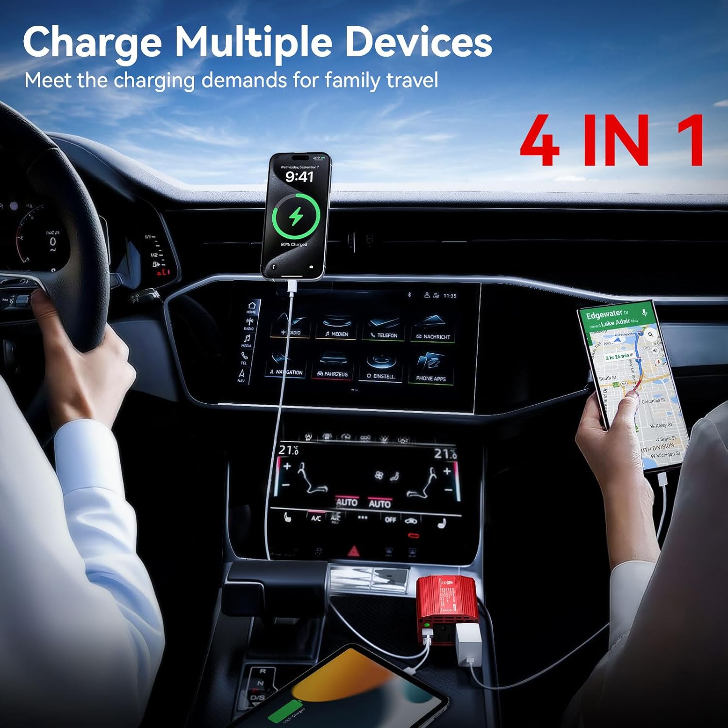 - ăSafe Protection & ReliableăBuilt-in intelligent chip, the car plug adapter provides multiple protections against short-circuit, overload, overvoltage and overheating. The metal housing is ultra compact and lightweight, it protects well against any drops or impacts that are natural on road trips or spending time outdoors.
