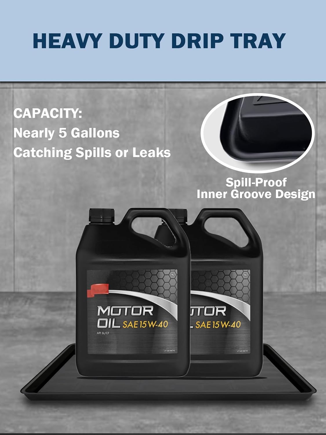 - 【Extra-Large Size】Measuring 35.4 x 24 x 1.4 inches, this oil drip pan for under car can hold up to 5 gallons of oil or liquid (Fully filled). It provides ample space to capture spills and prevent stains on your garage or workshop floor. With the large oil drip tray you would able to manage leaks effectively. Note: Please confirm dimensions before purchase to ensure it meets your specific needs.