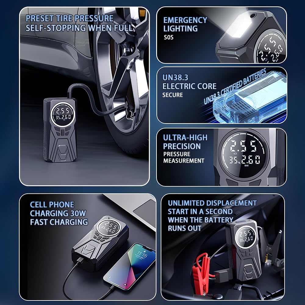 - STARTER WITH AIR COMPRESSOR UNIT: This car tire inflator has a massive 150PSI of pressure and is often the most commonly used piece of electrical equipment in a car. The portable air pump's high-quality air cylinder delivers a fast 20L/Min inflation, which can inflate tires from 32PSI to 36PSI in just one minute